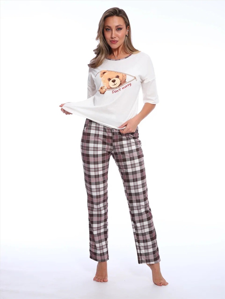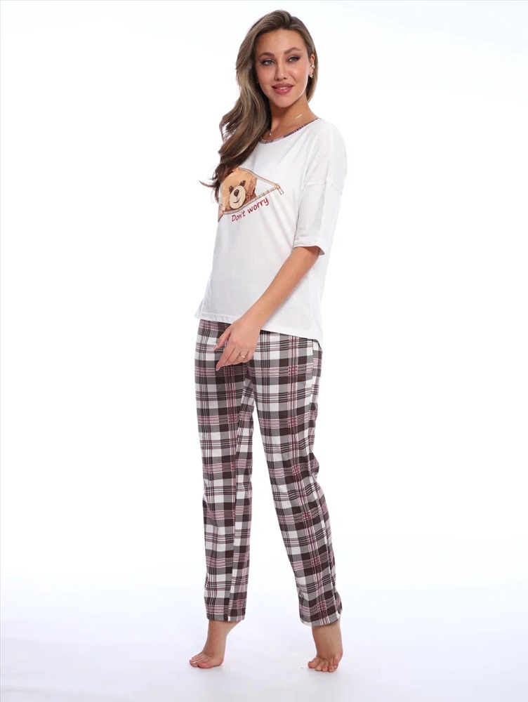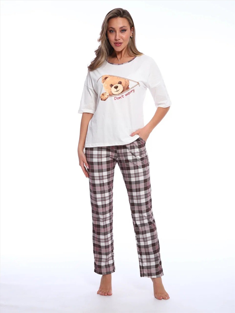 Женская пижама из 100% хлопка с рисунком медвежонка на удлиненной сзади футболками и клетчатыми брюками уют и стиль для вашего дома