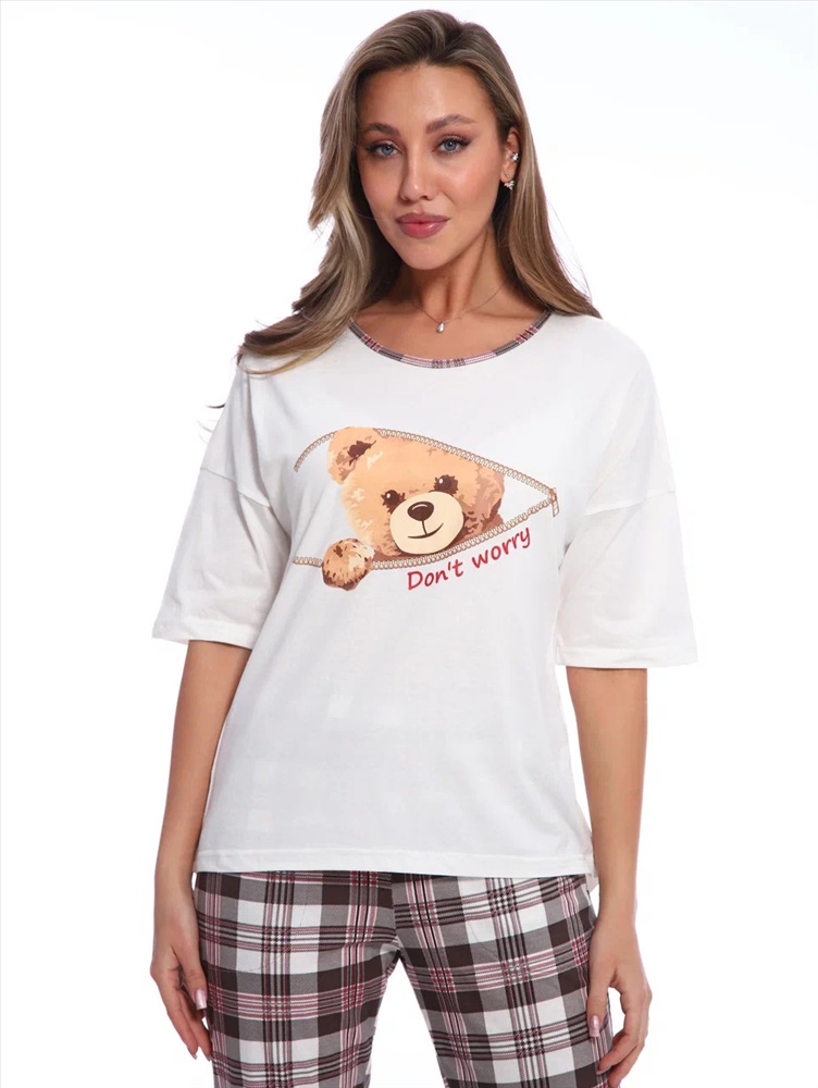 Стильный дизайн: Современное сочетание кремовой футболки с рисунком и клетчатых брюк подходит для женщин, ценящих комфорт и моду.