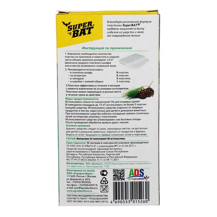 Производитель: Super Bat; Габариты: 11 x 1,5 x 6; Страна: Россия; В боксе: 45 набор; Состав: См. на упаковке; Материалы: см. на упаковке; Фасовка: по 1 набор; Индивидуальная упаковка: Цветная картонная коробка; Сертификат: РСТ; Область применения: От моли Пластины от моли SuperBAT надежно защитят в быту изделия из шерсти и меха от повреждений молью.Инструкция по применению: извлеките необходимое количество пластин из пакетиков и поместите в средней части объема хранения 1 м. куб. (величина среднего платяного шкафа) или местах возможного появления моли. Рекомендуется использовать: в платяном шкафу, на антресолях, в чемодане, в коробке с зимней обувью. Пластина эффективна в течение 6 месяцев с момента извлечения из упаковки. Пластины можно перемещать в разные места в течение срока их действия.Меры предосторожности: использовать только по назначению! Не для пищевых целей! В помещении площадью не более 15 кв.м. использовать не более 2-х пластин. Использовать средство отдельно от пищевых продуктов, в местах, недоступных для детей и домашних животных. Избегать попадания прямых солнечных лучей на открытую упаковку с пластинами. Использованное средство утилизировать как бытовые отходы. После проведения обработки вымыть руки с мылом.Действующее вещество: выпортрин (d- эмпентрин) 30 мг/пластина.