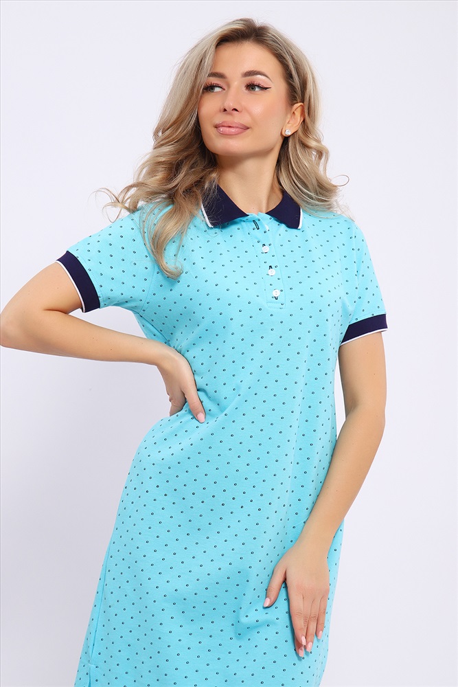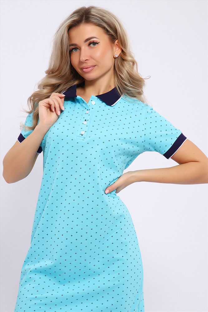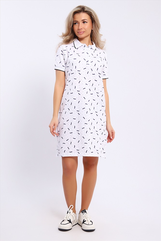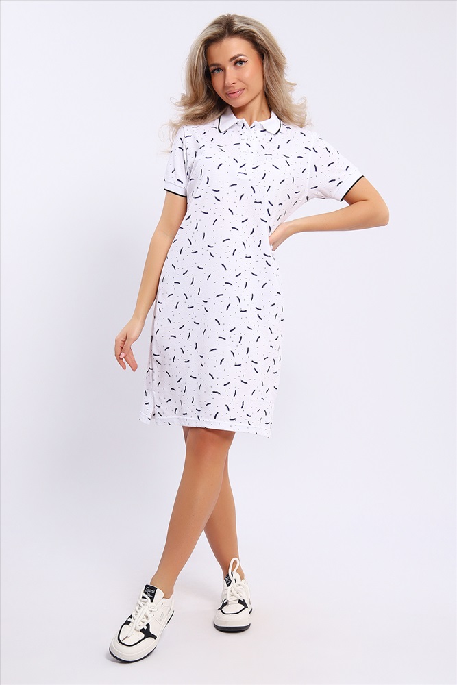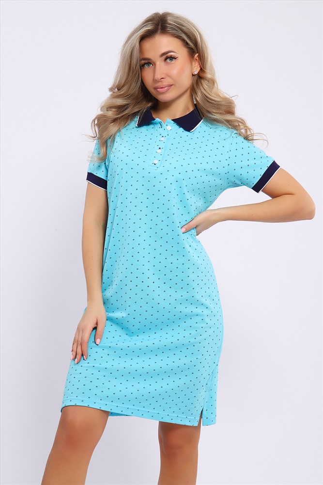 Платье-поло выполнено из лакосты набивного качества пенье. Воротник и манжеты вязаные, застежка - планка на пуговицы, по бокам разрезы. Платье очень удобное, комфортное, отлично подойдет как для дома, так и для прогулок и отдыха.
