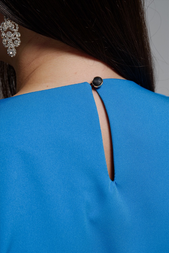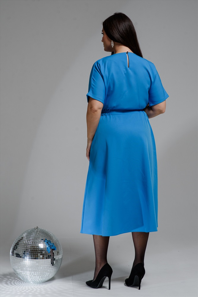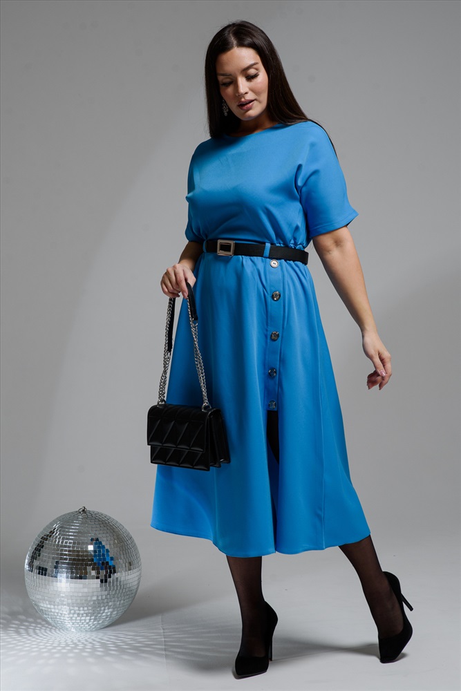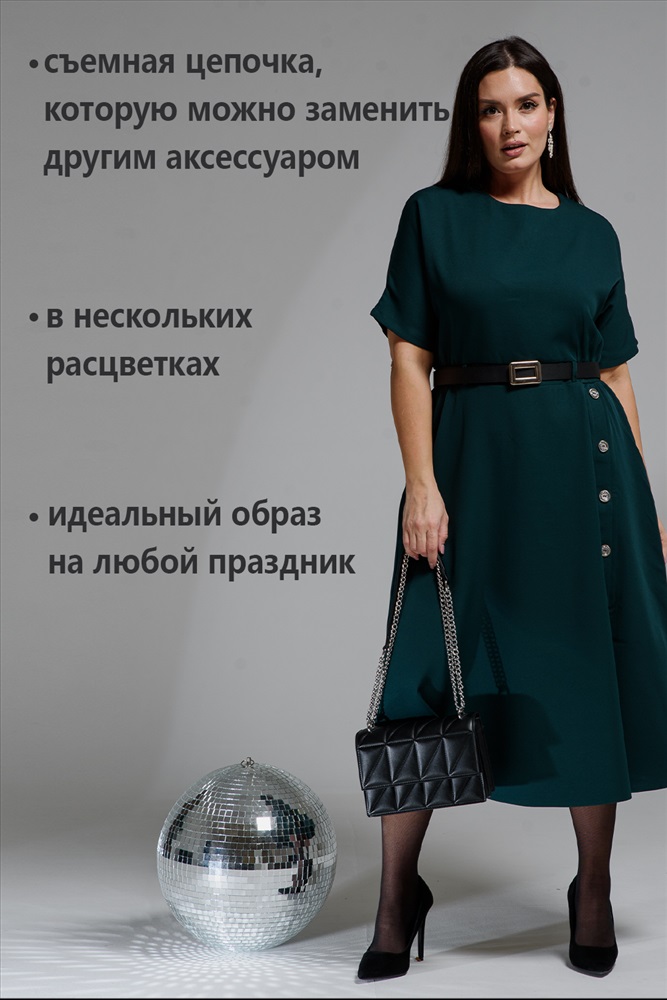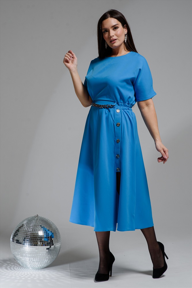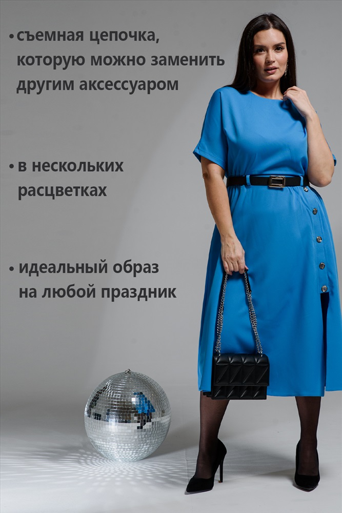 Элегантное женское платье миди представлено в трех расцветках . Изделие приталенное на резинке, с коротким рукавом (выше локтя), округлой горловиной и вырезом снизу, его дополняют декоративные элементы на поясе в виде цепочки и пуговиц от талии к вырезу. Платье подойдет на каждый день, на работу, на праздник. Деловое, но в то же время женственное.