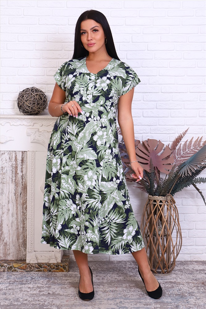 Платье женское удлиненное со спущенным рукавом, на полочке подрез, планка на трех декоративных пуговицах, внизу расклешение. Рисунок ткани красивый, насыщенный. Модель придает легкость, изящность, подойдет на каждый день, для прогулки и дома.