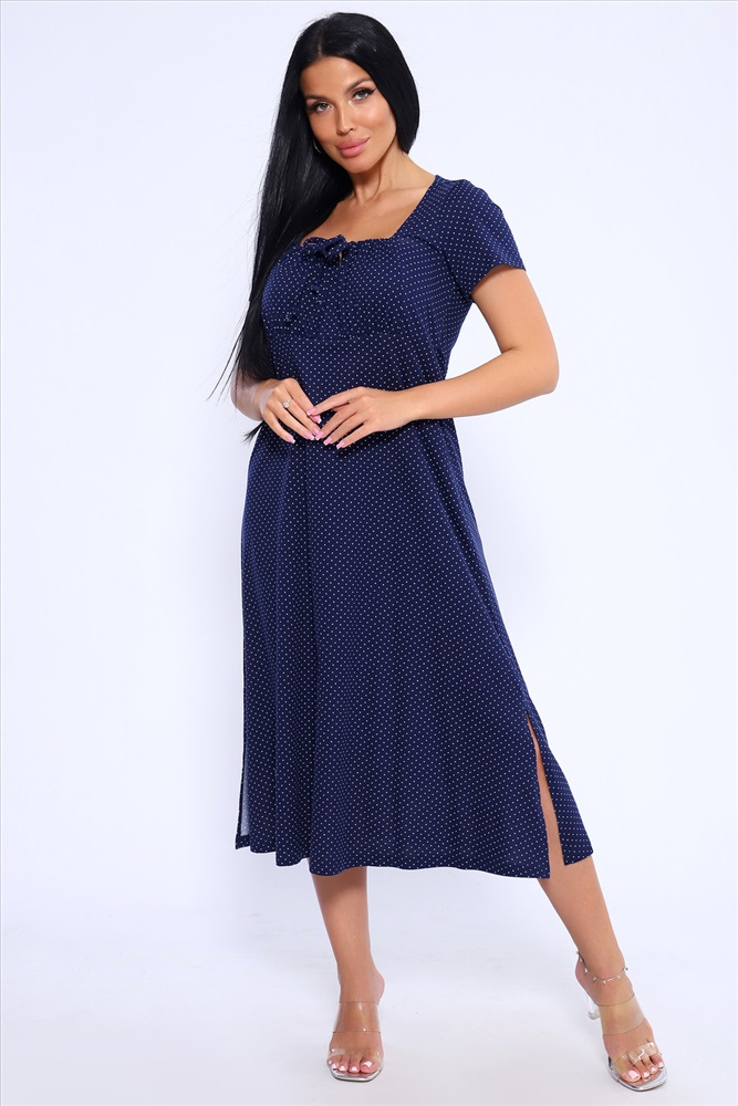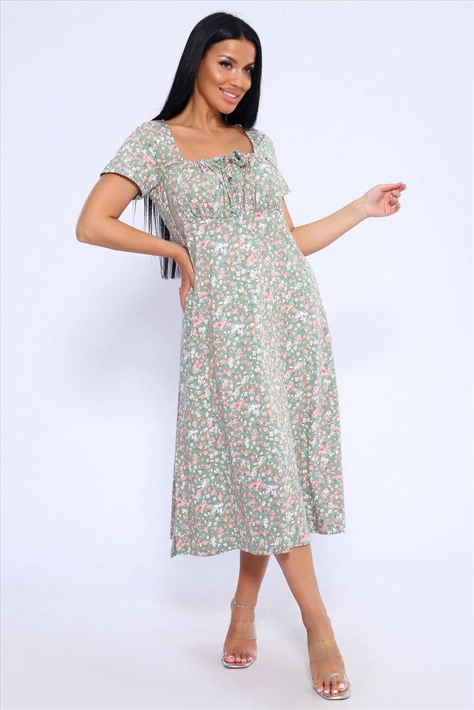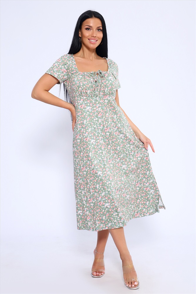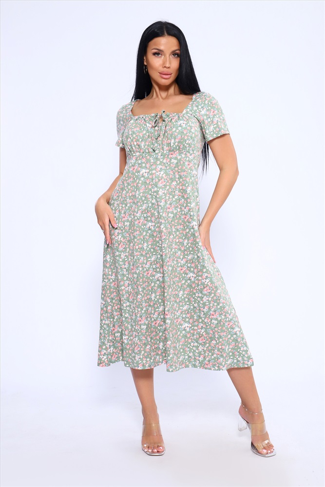Длинное романтичное платье с короткими рукавами, декорировано квадратным вырезом декольте с завязками на груди. Милое, воздушное платье ниже колена с разрезами по боковым швам. Платье имеет свободный крой А-силуэта, который подходит для разного типа фигуры. Модель подойдет для прогулок, отдыха на пляже.