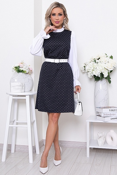 Комбинированное платье из жаккардового трикотажного полотна с рукавами из текстильного полотна и рюшей по горловине. Ремень в комплект не входит. Комментарии к товару