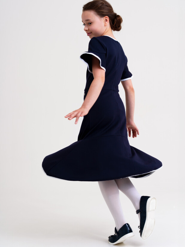 Свободный крой позволяет чувствовать себя уверенно и свободно — как на занятиях, так и во время школьных мероприятий. Неброский дизайн и тёмно-синий цвет универсального трикотажного платья для девочек соответствуют школьному дресс-коду, а аккуратная молния сзади упрощает процесс переодевания.