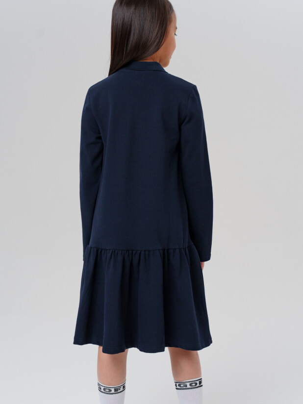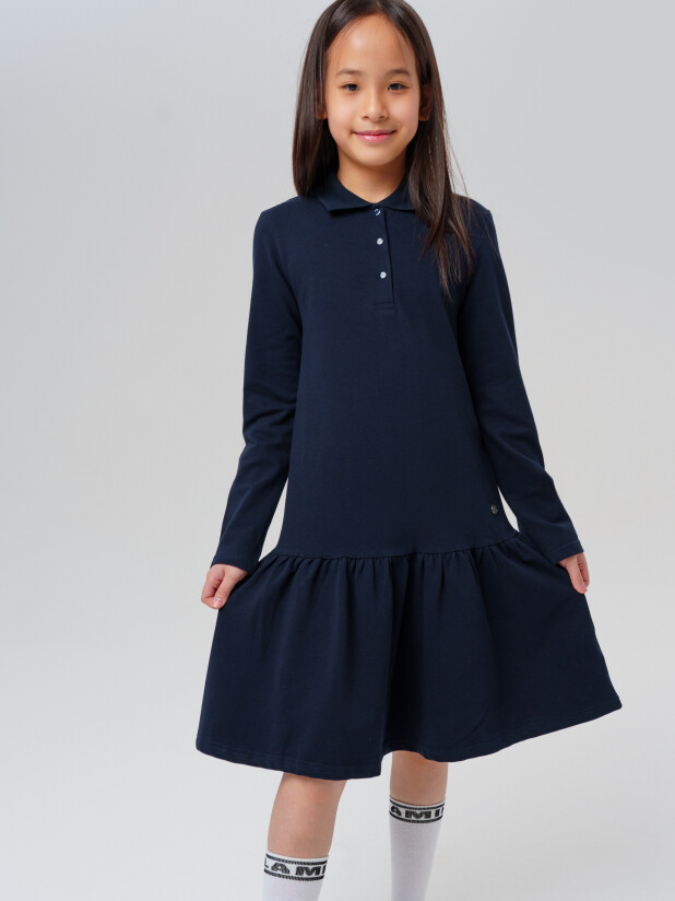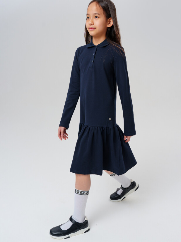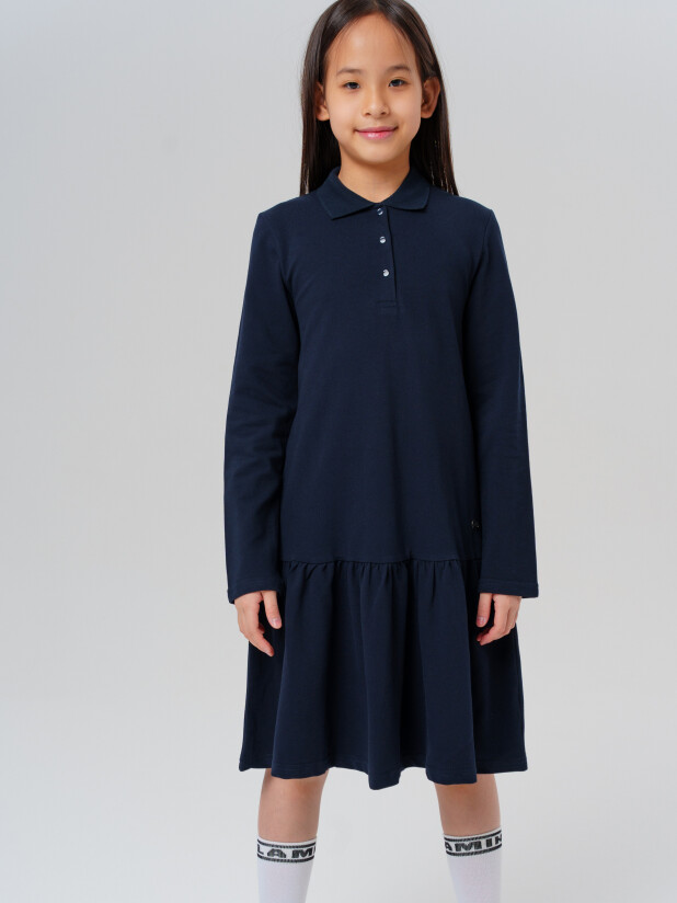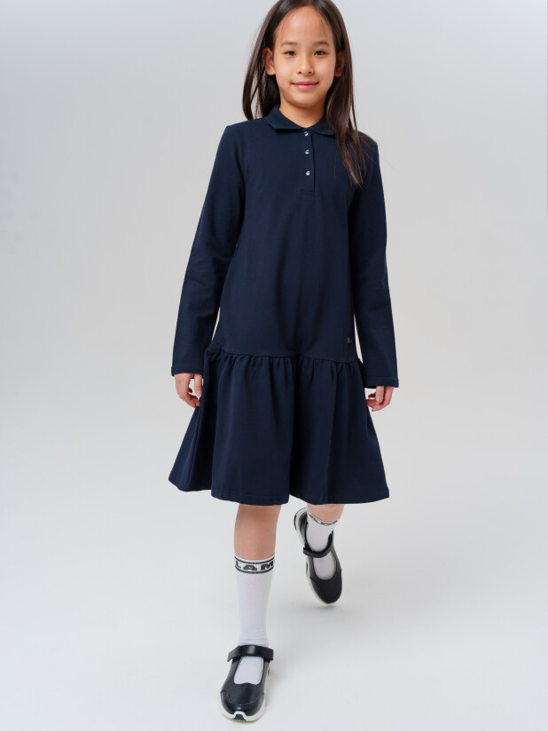 Модное тёмно-синее трикотажное платье поло в школу для девочки от PlayToday — это практичный и стильный выбор для тех, кто ценит комфорт, уверенность и аккуратность в повседневной жизни.