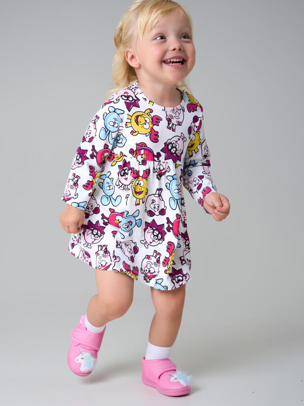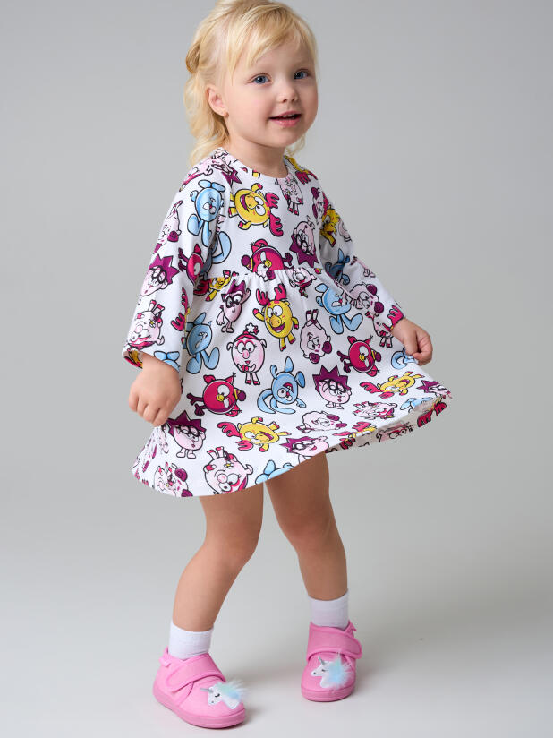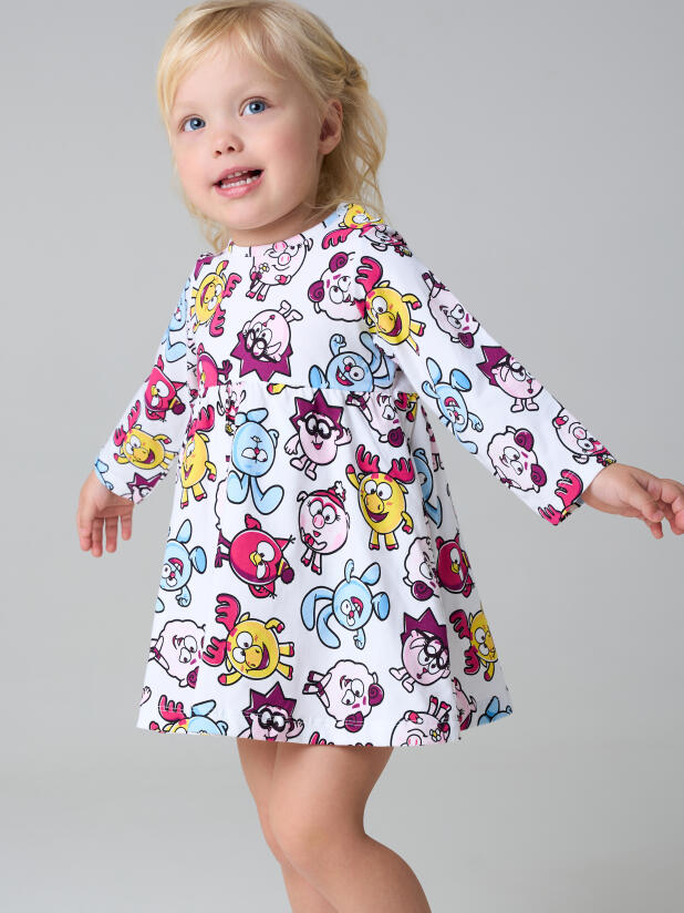 Белое детское платье с героями “Смешарики” для девочки от PlayToday — яркая и удобная модель для малышей. Платье выполнено из мягкого трикотажа на основе хлопка с добавлением эластана: дышит, тянется и не сковывает движений. Свободный А-силуэт, длинные рукава и милый принт с любимыми персонажами делают это платье идеальным для повседневной носки, прогулок и детского сада.