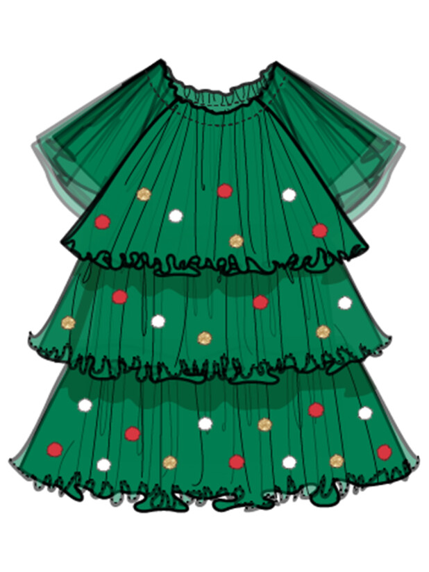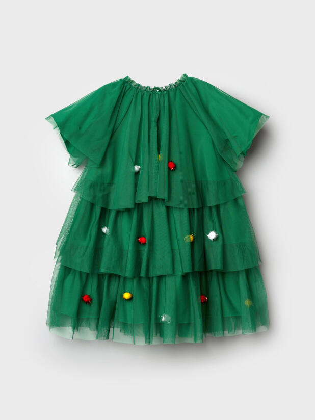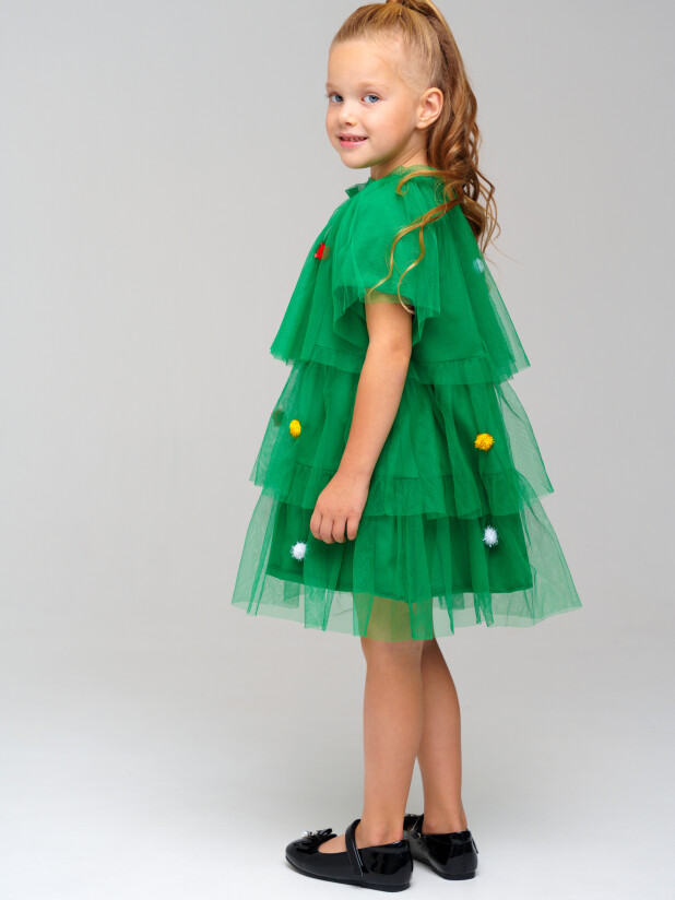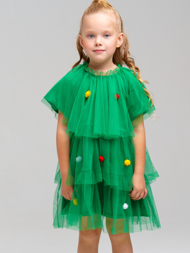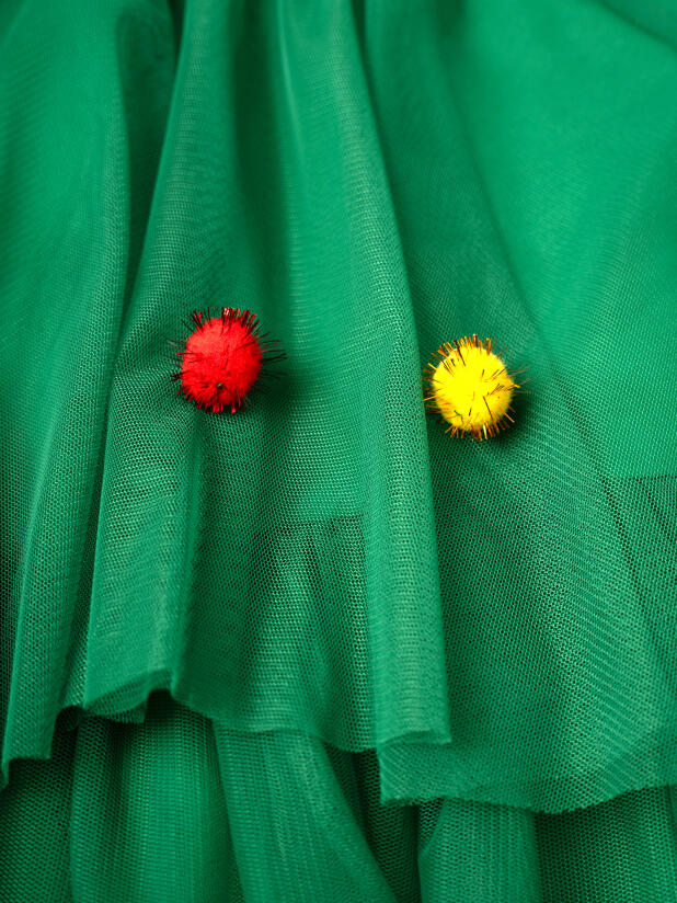 Платье карнавальное - ёлочка. Подкладка из трикотажа с высоким содержанием хлопка 95%. Благодаря наличию эластана в составе ткани, изделие держит форму и меньше мнется. Без застежек. Сверху мягкая сетка, декорированная разноцветными помпонами.