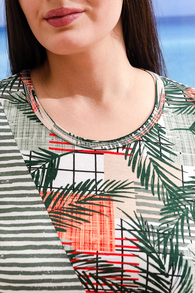 Платье женское полу-прилегающее, горловина округлая, рукав втачной короткий. В боковых швах разрезы. Верхняя боковая часть полочки, рукава и верхняя часть спинки из модной ткани в полоску. В шве стачивания верхней и нижней частей полочки внутренний карман с горизонтальным входом.