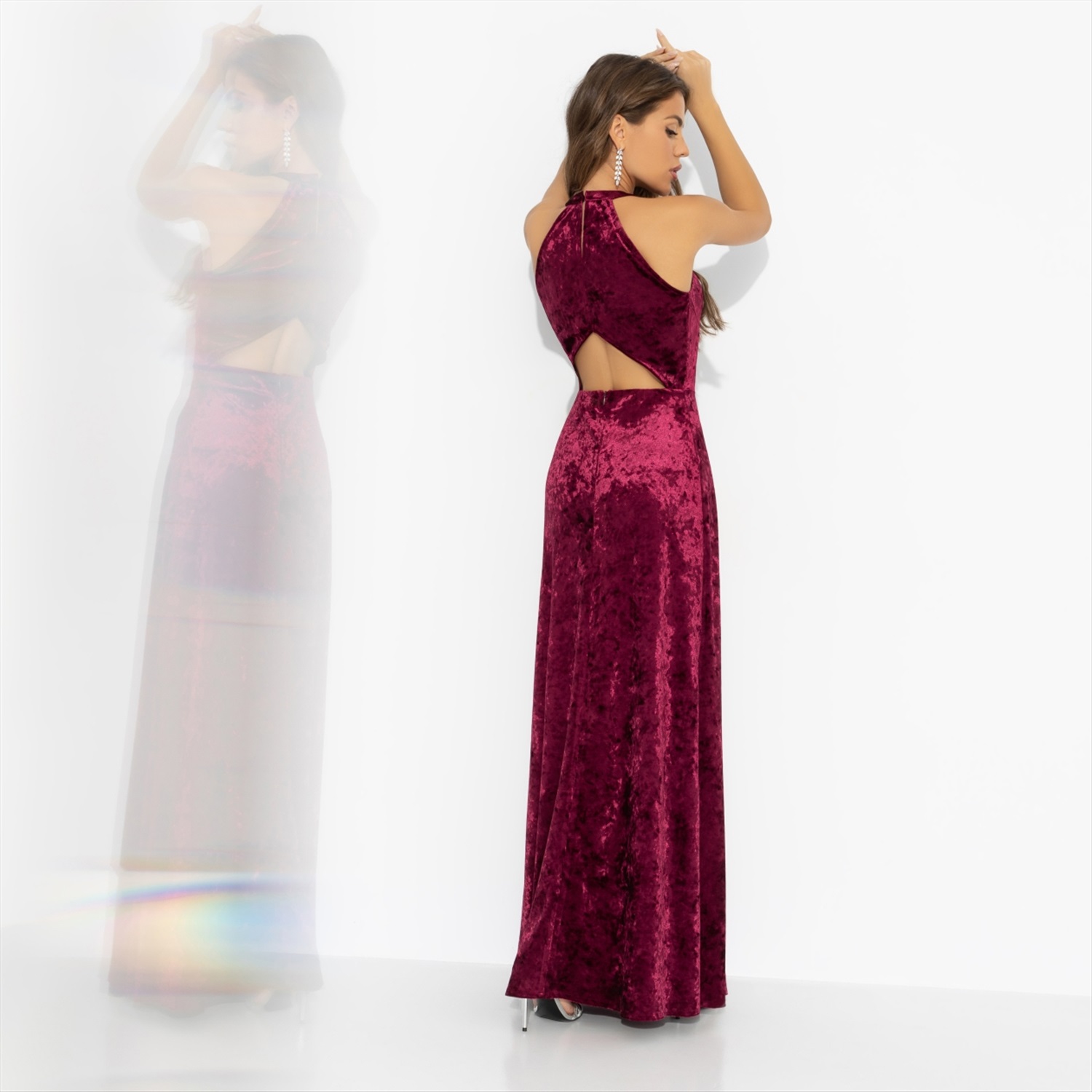 Хочешь повторить образ Зендеи с красной дорожки? Отличный выбор, ведь каждый ее выход воплощает уверенность, смелую элегантность и магию момента. Такое платье поможет тебе сформировать и поддерживать ауру селебрити, ведь бархатный блеск всегда в центре внимания. Бархатное платье струится по фигуре и эффектно играет на свету. Длина в пол добавляет драмы. Открытая спина равно сексуальность. Ты ‒ королева новогоднего вечера.