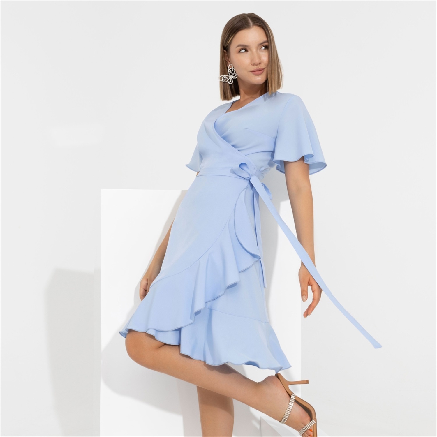 ТН ВЭД: 6204430000; Состав: «Ниагара» (65% п/э, 30% вискоза, 5% эластан); Плотность ткани: Тонкая; Тип ткани: Текстиль; Вид застежки: Завязки; Карманы: Нет; Основной цвет ткани: Голубой; Отрезная талия: Есть; Подклад: Нет; Резинка по талии: Нет; Рисунок/раппорт: Нет, все изделия идентичны; Сезон: Лето