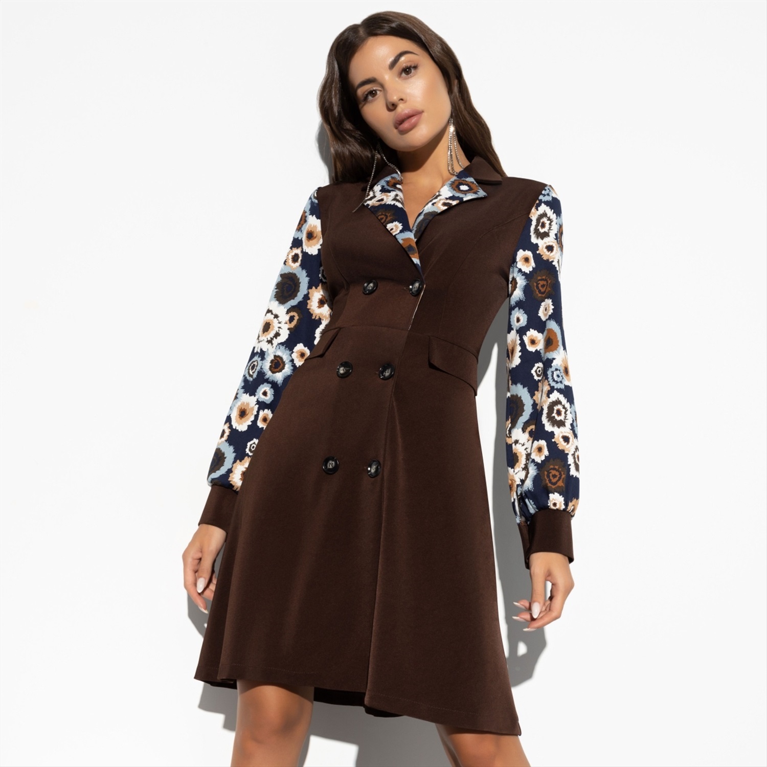 ТН ВЭД: 6204430000; Состав: «Мартьяно», «хлопок стрейч» (60% п/э, 37% вискоза, 3% спандекс); Плотность ткани: Средняя; Тип ткани: Текстиль; Вид застежки: Пуговица/-ы; Дополнительный цвет ткани: Разноцветный; Карманы: Нет; Основной цвет ткани: Коричневый; Отрезная талия: Есть; Подклад: Нет; Резинка по талии: Нет; Рисунок/раппорт: Каждое изделие уникально из-за расположения рисунка на ткани; Сезон: Демисезон