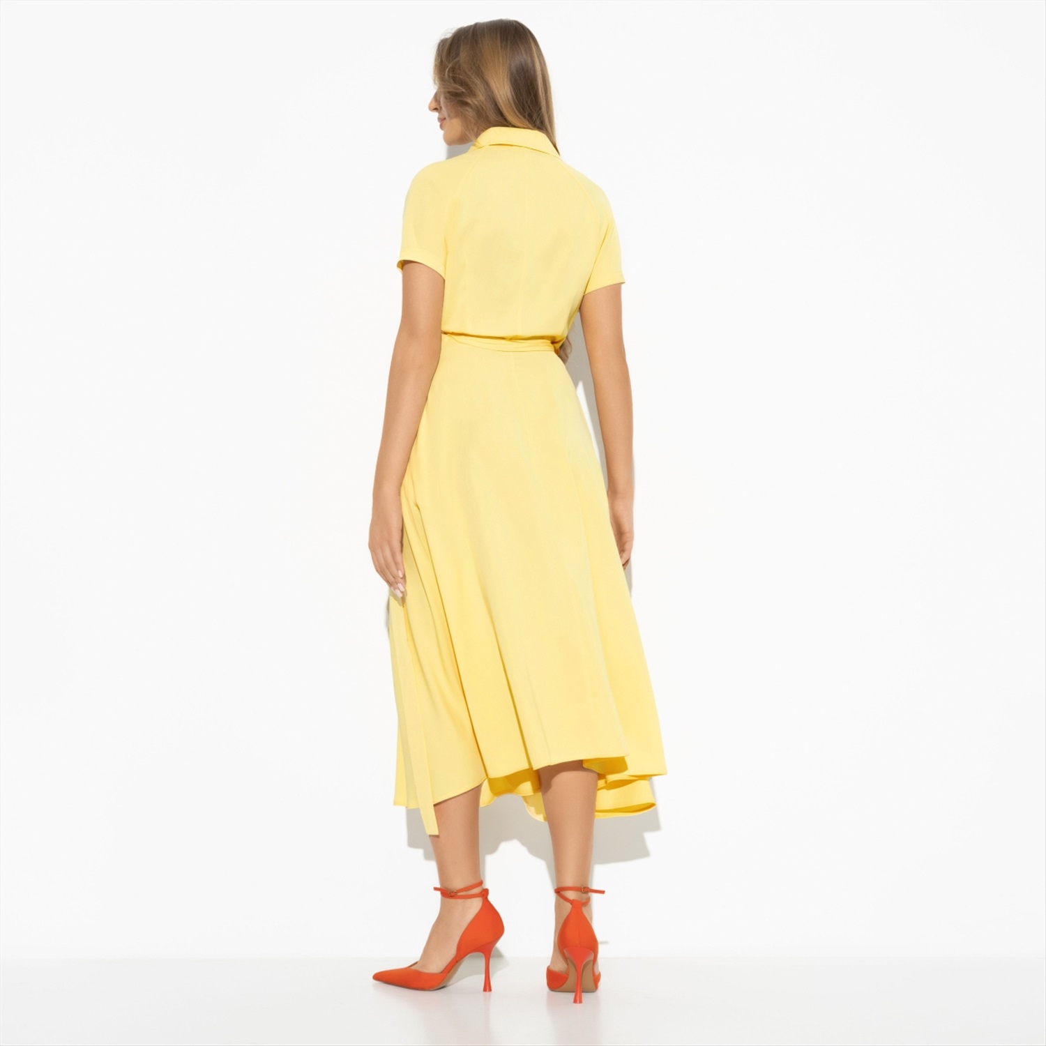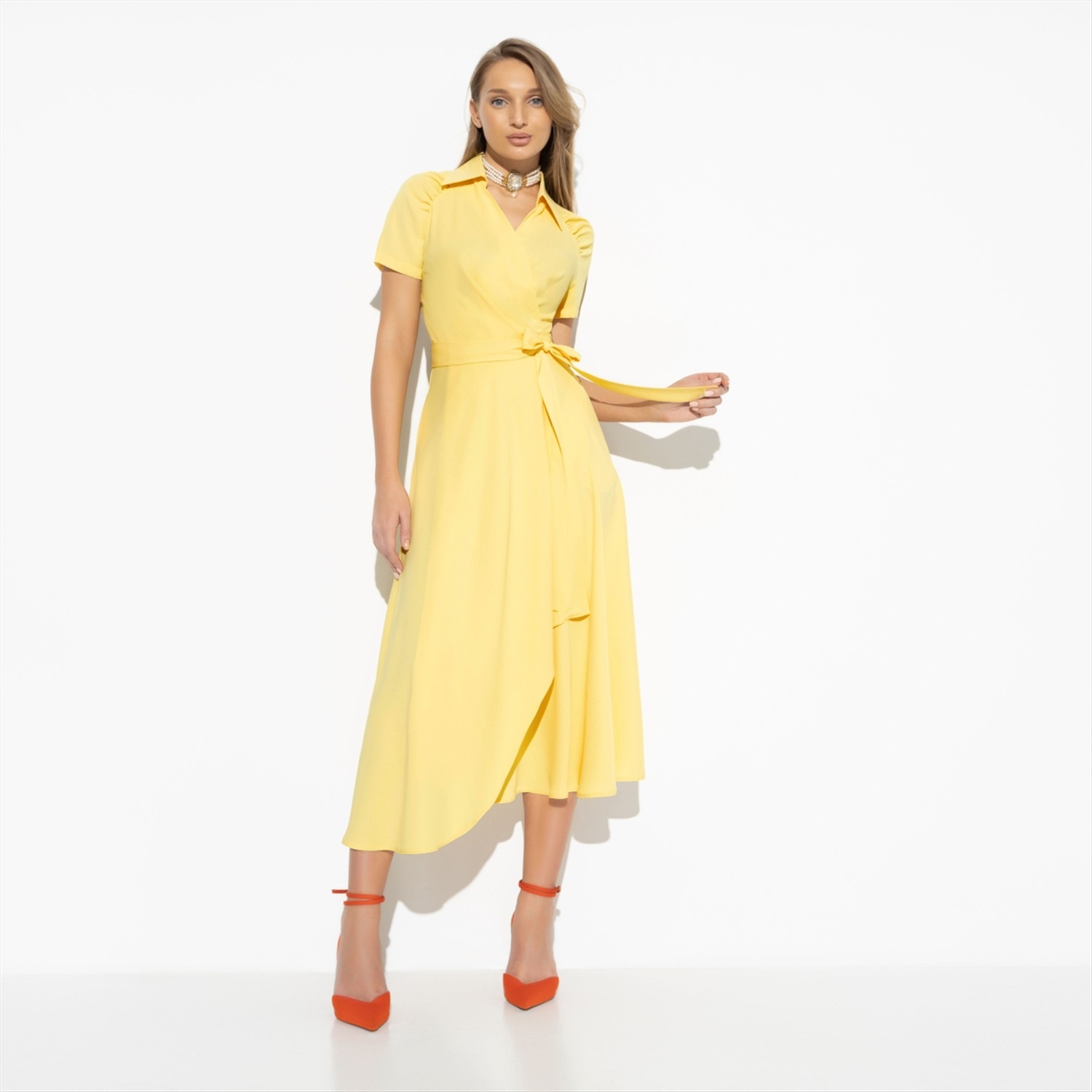 ТН ВЭД: 6204430000; Состав: Плательная ткань «риана» (95% п/э, 5% спандекс); Плотность ткани: Средняя; Тип ткани: Текстиль; Вид застежки: Пояс; Карманы: В боковом шве; Основной цвет ткани: Жёлтый; Отрезная талия: Есть; Подклад: Нет; Резинка по талии: Нет; Рисунок/раппорт: Нет, все изделия идентичны; Сезон: Лето