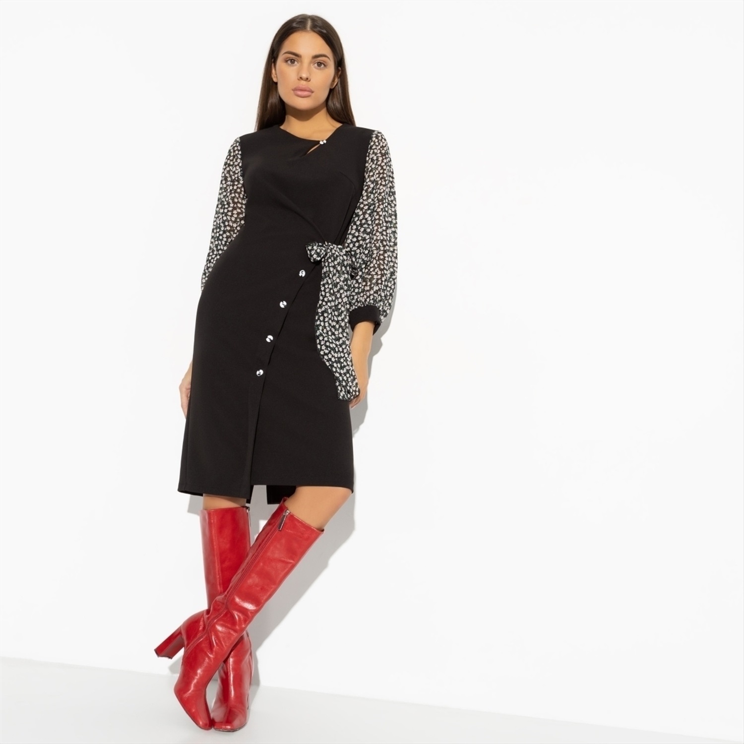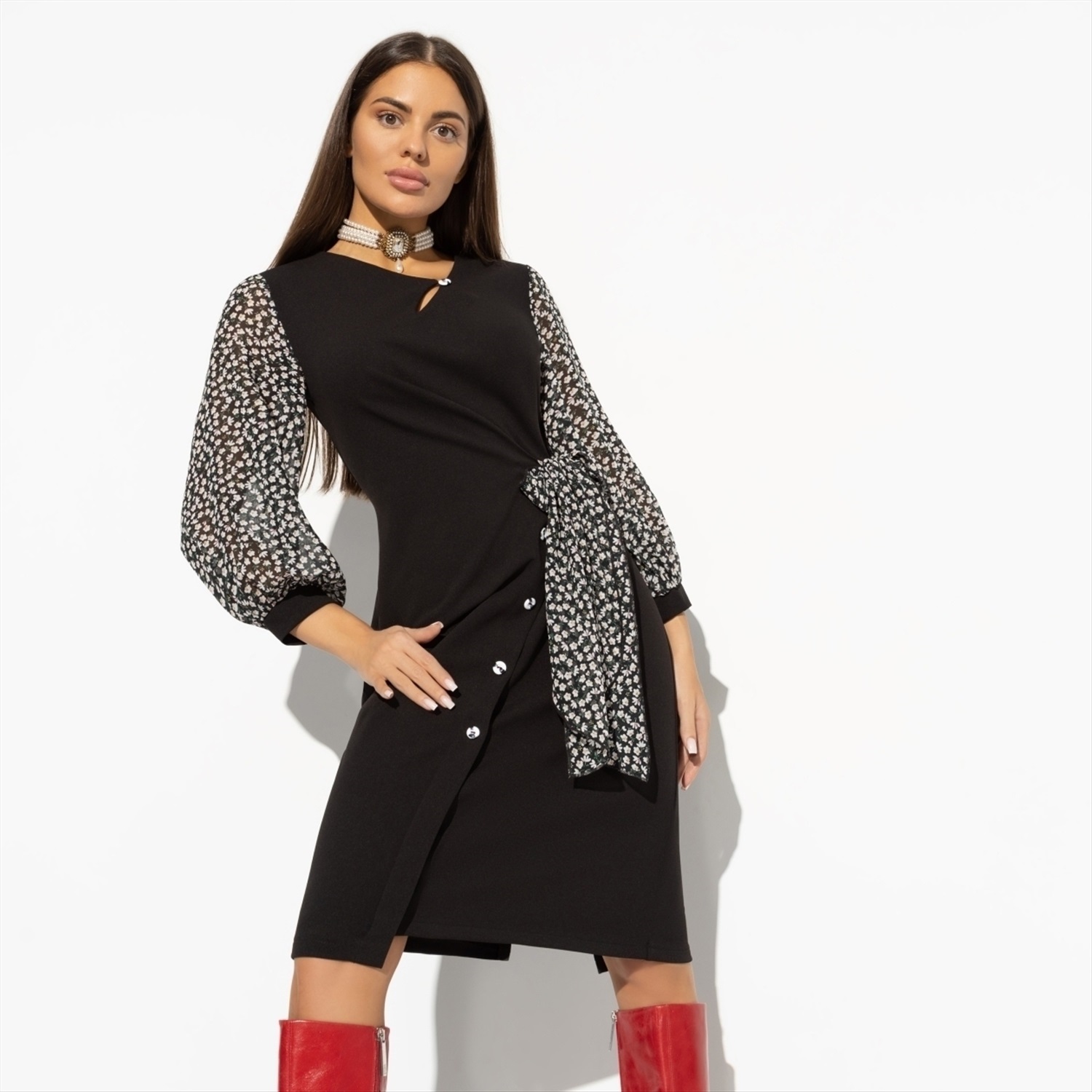 ТН ВЭД: 6104430000; Состав: Трикотаж «креп-скуба», шифон (95% п/э, 5% спандекс); Плотность ткани: Средняя; Тип ткани: Трикотаж, текстиль; Вид застежки: Пуговица/-ы; Дополнительный цвет ткани: Разноцветный; Карманы: Нет; Основной цвет ткани: Черный; Отрезная талия: Нет; Подклад: Нет; Резинка по талии: Нет; Рисунок/раппорт: Нет, все изделия идентичны; Сезон: Демисезон