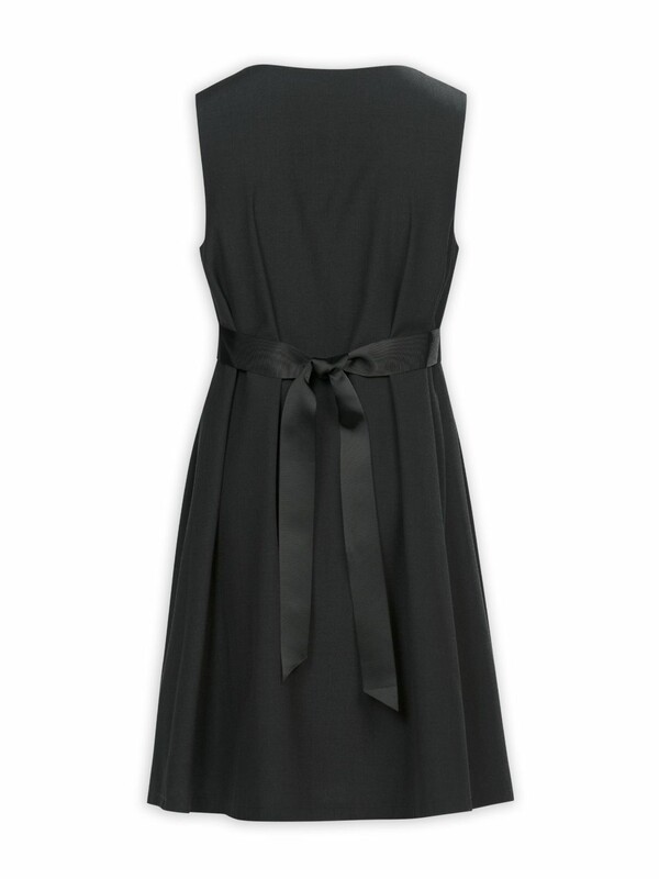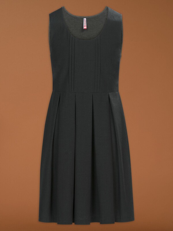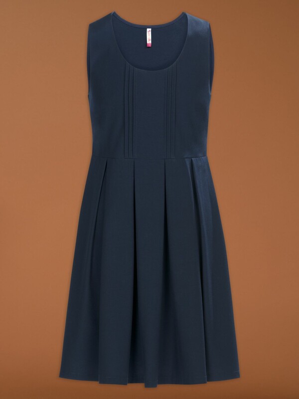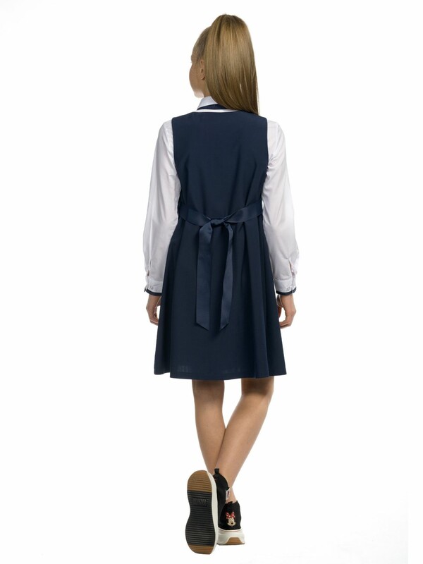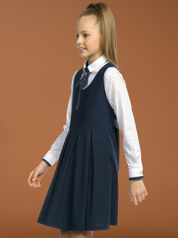 Сарафан для девочки в темно-синем цвете. Подойдет в качестве повседневного элемента школьной формы. Изделие соткано из двух частей, свободно сидит и не имеет застежки. Грудка декорирована вертикальными строчками, а в юбку заложено шесть складок, чтобы сделать изделие комфортным и свободным. Спинка цельная, книзу чуть расширяется, объем хорошо регулируется репсовой тесьмой, которую можно завязать на бант.