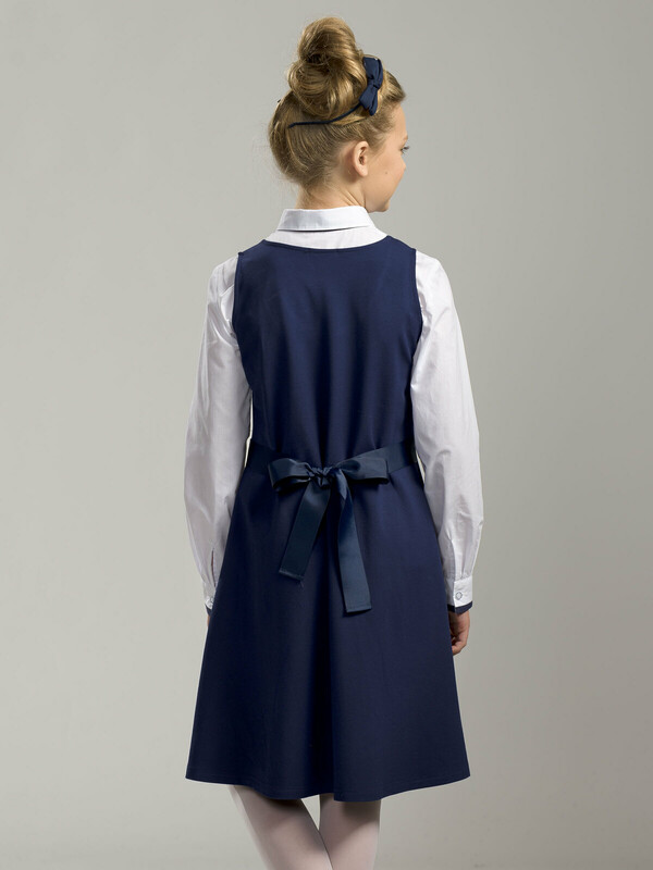 Школьный сарафан для маленьких принцесс. Изделие с округлым вырезом без застежки легко надевать и снимать, что так ценят самостоятельные леди. Завязка на бант из репсовой ленты сзади позволяет регулировать ширину и выбирать, что надеть под платье плотную водолазку или легкую блузу для торжественных случаев. Универсальные цвета не требуют частой стирки, а трикотаж на основе вискозы, обеспечит долгую практичную носку и простоту ухода.