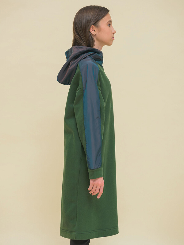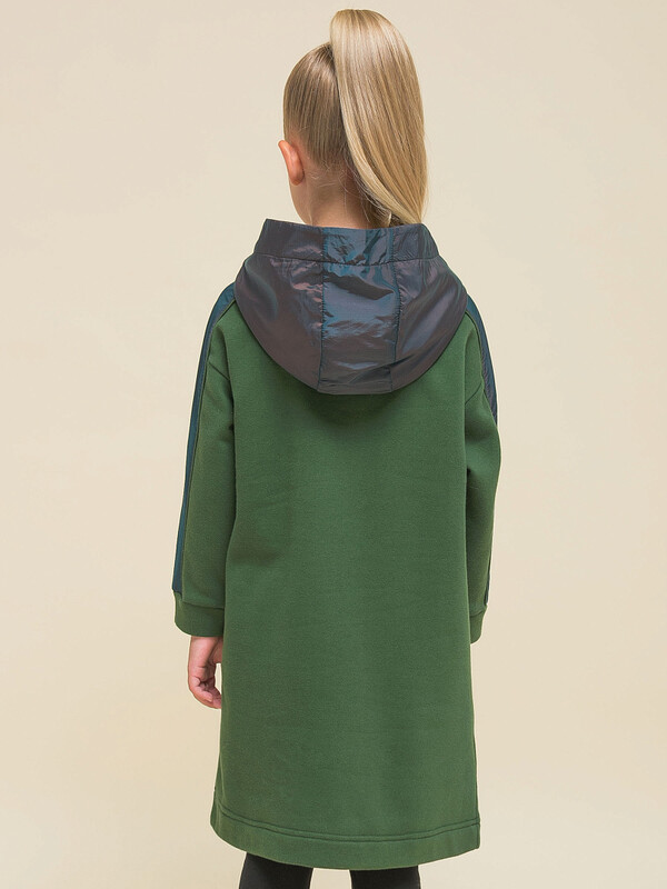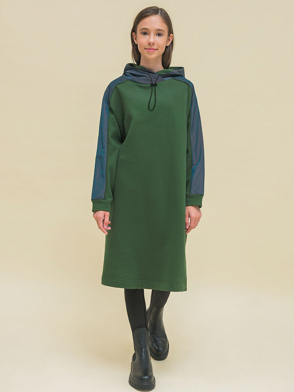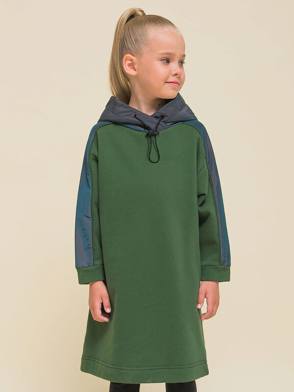 Детское платье-худи длиной ниже колена для девочки. Худи с капюшоном выполнено из футера с начёсом и дополнено элементами из гладкой курточной ткани. Сочетание материалов разной фактуры в одном изделии — один из наиболее актуальных трендов сезона. Капюшон и вставки на рукавах из курточной ткани — практичное решение, ребенок не промокнет под дождём. Вдоль вставок кант из мягкой хлопковой ткани. Худи для девочек модного оверсайз-силуэта со спущенным плечом подарит ребёнку свободу движений и ощущения комфорта и уюта. На капюшоне предусмотрена регулировка эластичным шнуром со стопперами.Двойной капюшон - швы закрыты, смотрится аккуратно. Манжеты рукавов из основной ткани. В боковых швах карманы  — удобно пользоваться. Худи однотонное, без принта. За ним просто ухаживать. В составе основной ткани преобладает высококачественный хлопок — платье приятно на ощупь и великолепно попускает воздух, давая коже ребёнка дышать. Благодаря полиэстеру толстовка легко стирается и быстро сохнет, сохраняет отличную форму надолго. Вставки выполнены из материала, в составе которого нейлон и полиэстер — они прочные, не выгорают и не растягиваются - актуальный тред. Платье выполнено в зелёном цвете (трендовый оттенок хаки). Размерная линейка: 3 (98); 4 (104); 5 (110); 6 (116); 7 (122); 8 (128); 9 (134); 10 (140); 11 (146). Платье-худи утеплённое подходит для девочек дошкольного и младшего школьного возраста, а также девочек-подростков. Его можно носить в детский сад, на прогулки, на отдых, дома. Худи с капюшоном идеально для круглогодичной носки: прохладным летом, осенью и весной (демисезон), зимой. Чудесный подарок дочери, внучке или сестре на Новый год и любой другой праздник.