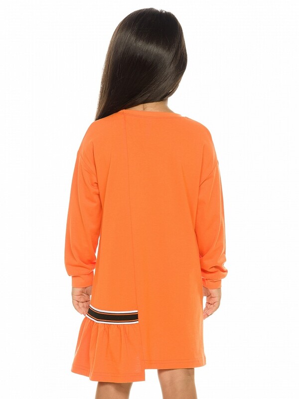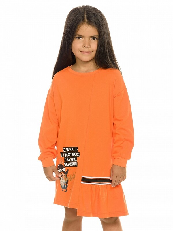 Трикотажное платье спортивного стиля увеличенного объёма с мягким спущенным плечом. Широкий рукав собран на манжету из основной ткани. Асимметричный крой с вертикальным членением по всей длине. По левому нижнему краю притачной волан. Декор  эластичная тесьма в полоску. Rubber принт с золотом, глиттером и стразами. Перевод Ну и что, что я не послушная, я все еще красотка.