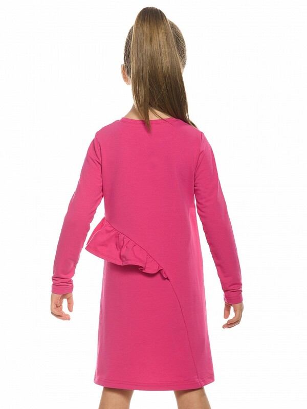 Платье для девочек из футера А силуэта. Аккуратный втачной рукав, небольшая горловина. Фишка декоративный асимметричный рельеф необычной округлой формы по переду и по спинке до низа изделия. В рельеф вставлен волан. Rubber принт с золотым металликом и глиттером. Надпись Чудеса случаются. Вуаля.