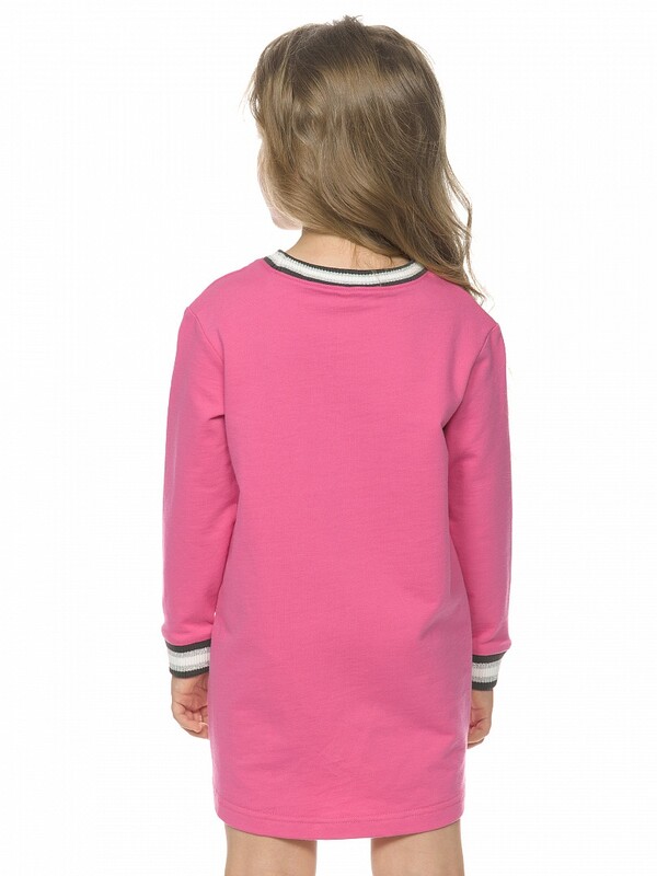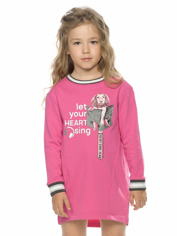 Состав: 100%хлопок Платье для девочек из футера свободного силуэта со слегка спущенным плечом, зауженное книзу, боковые швы переведены на перед, перепад длины переда и спинки, рукав умеренного объема, горловина и манжеты рукавов из рибаны с люрексом. Мягкий эластичный принт с серебряным блеском. Перевод Позволь своему сердцу петь и Музыка сердца. Комментарии к товару