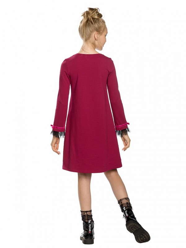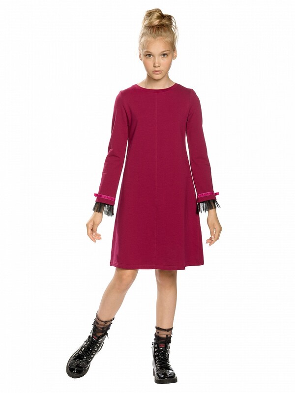 Состав: 96%хлопок 4%эластан Платье для девочек. Новинка кроя! Платье из эластичного футера, силуэт-трапеция: в верхней части более прилегающее, к низу более расширенное. Облегающие рукава вверху, расширяются к низу; по низу рукавов плиссированная сетка с настроченной бархатной лентой и бантиком; декоративный центральный шов по переду изделия. Комментарии к товару