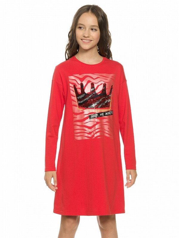 Состав: 100%хлопок Платье свободного объёма, силуэт трапеция. Glossy rubber принт с розовым металликом и золотым глиттером. Корона из переворачивающихся пайеток. Комментарии к товару