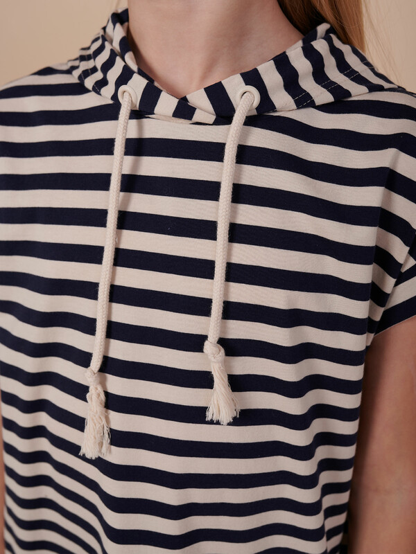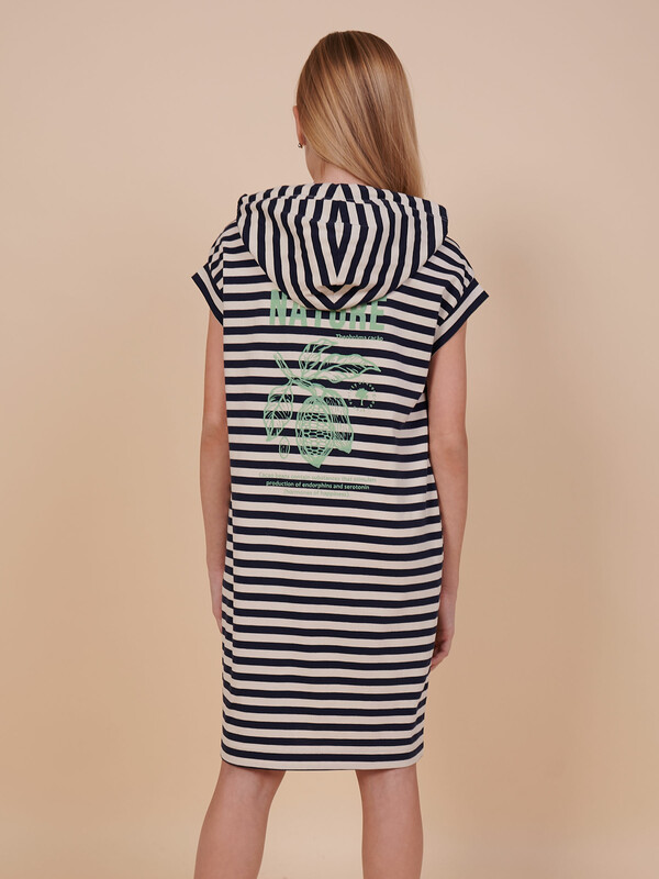 Производитель: Pelican Детское платье худи в полоску для девочки. Платье в спортивном стиле А-силуэта подойдёт для любого типа фигуры. Это идеальный вариант для летнего отдыха — благодаря капюшону нет необходимости в панаме, голову ребёнка не напечёт солнцем. Капюшон двухшовный, красиво и анатомически правильно садится по голове. Есть возможность регулировки капюшона шнуром. Платье-тельняшка — супертренд сезона! Платье умеренного объёма со спущенным плечом подарит ребёнку комфорт и свободу движения. Проймы с широкими притачными манжетами, они отлично держат форму, платье выглядит аккуратно и стильно. В боковых швах имеются карманы  — удобно пользоваться. Платье в полоску (полоска вытканная, не принт) украшено красивым принтом в ботаническом стиле по спинке. На принте изображены какао-бобы. Надписи переводятся: "природа", "шоколадное дерево", "вечнозелёное дерево", "какао-бобы содержат вещества, которые стимулируют выработку эндорфинов и серотонина (гормоны счастья)". Принт мягкий и стойкий, не боится частых стирок. За платьем легко ухаживать. В составе ткани 100% высококачественного хлопка — платье мягкое и дышащее. Изделие представлено в двух актуальных вариантах цвета: тёмно-синем и бордовом. Размерная линейка: 1 (86); 2 (92); 3 (98); 4 (104); 5 (110); 6 (116); 7 (122); 8 (128); 9 (134); 10 (140); 11 (146). Платье-худи укороченное идеально для девочек дошкольного и младшего школьного возраста, а также девочек-подростков. Подходит для детского сада, прогулок, отдыха, дома. Платье можно носить летом, а также весной и осенью (демисезон), зимой в качестве домашней одежды. Модное платье — стильный и практичный подарок дочери, внучке или сестре на любой праздник. Выбирайте нужный размер по таблице размеров на фото. Цвет товара на экране вашего устройства может отличаться от цвета изделия вживую.