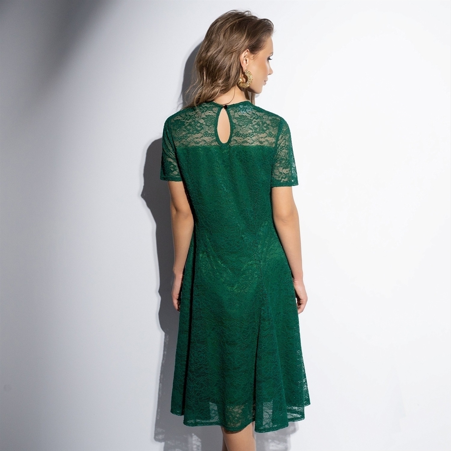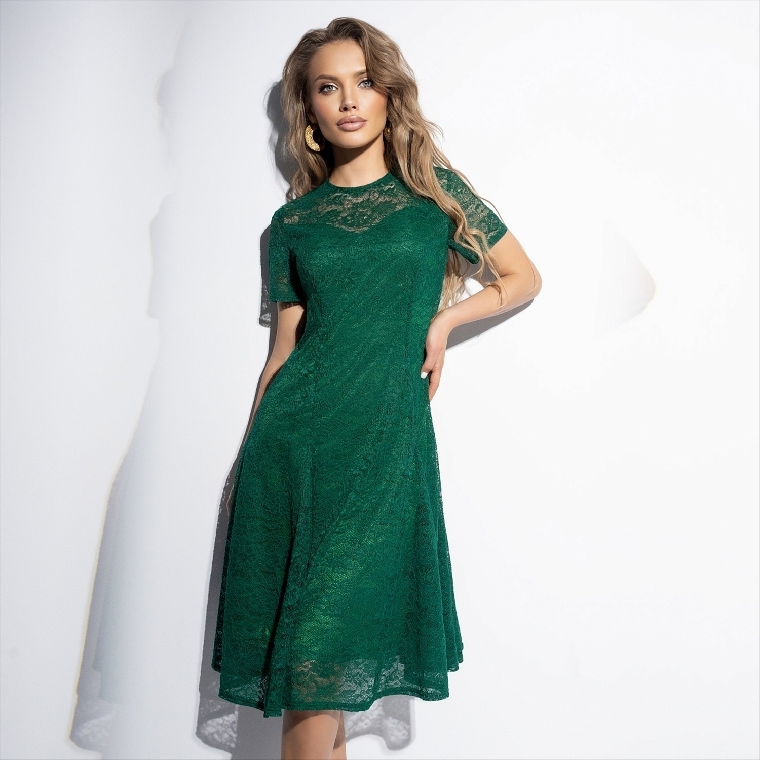 ТН ВЭД: 6104430000; Состав: «Кружево стрейч», «трикотажный подклад» (95% п/э, 5% спандекс); Плотность ткани: Тонкая; Тип ткани: Трикотаж; Вид застежки: Пуговица/-ы; Карманы: Нет; Основной цвет ткани: Зелёный; Отрезная талия: Нет; Подклад: Есть; Резинка по талии: Нет; Рисунок/раппорт: Нет, все изделия идентичны; Сезон: Круглогодичный; Силуэт: Приталенный; Стиль: Нарядный