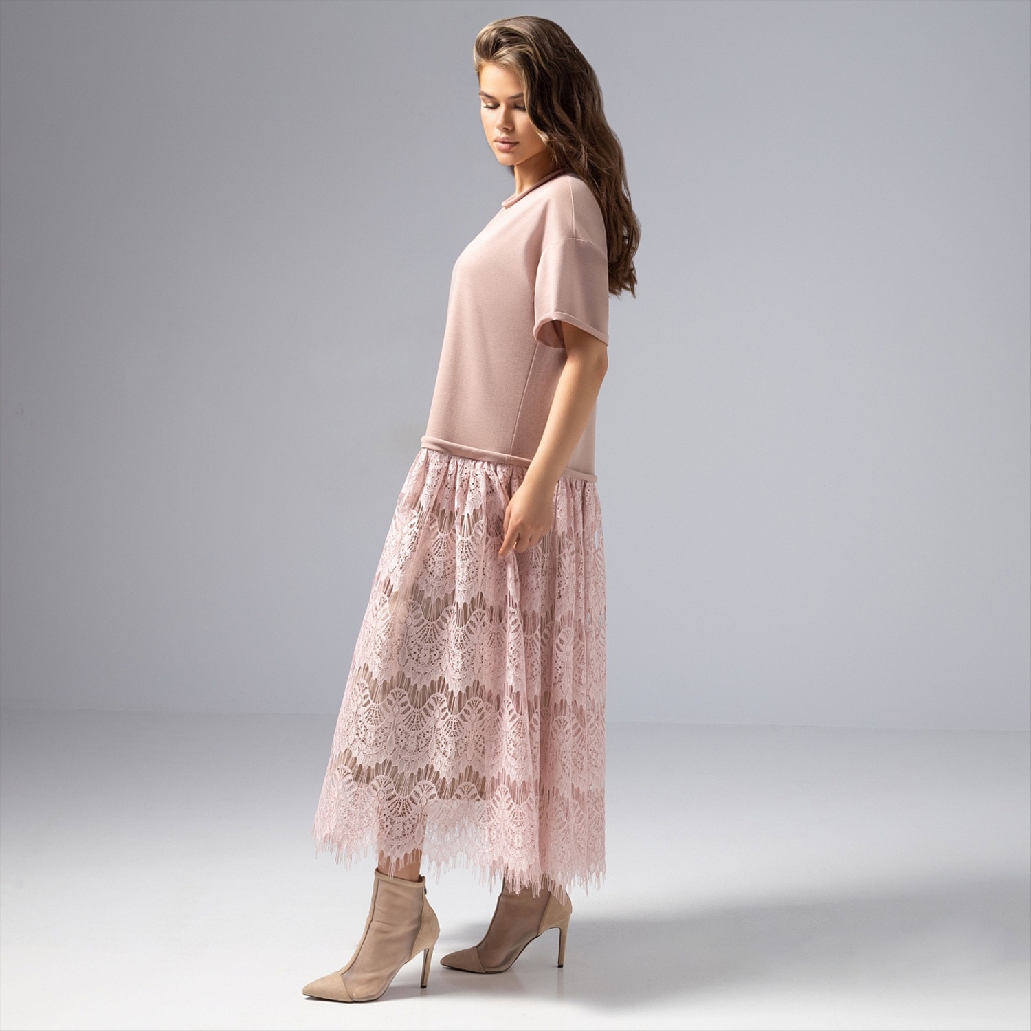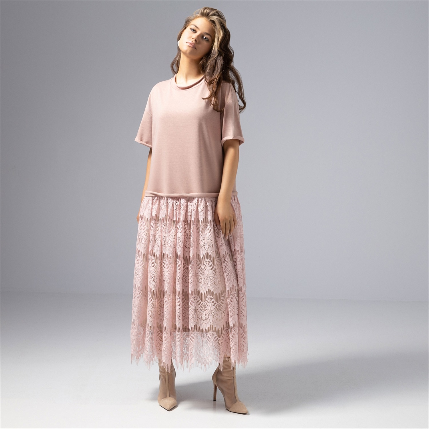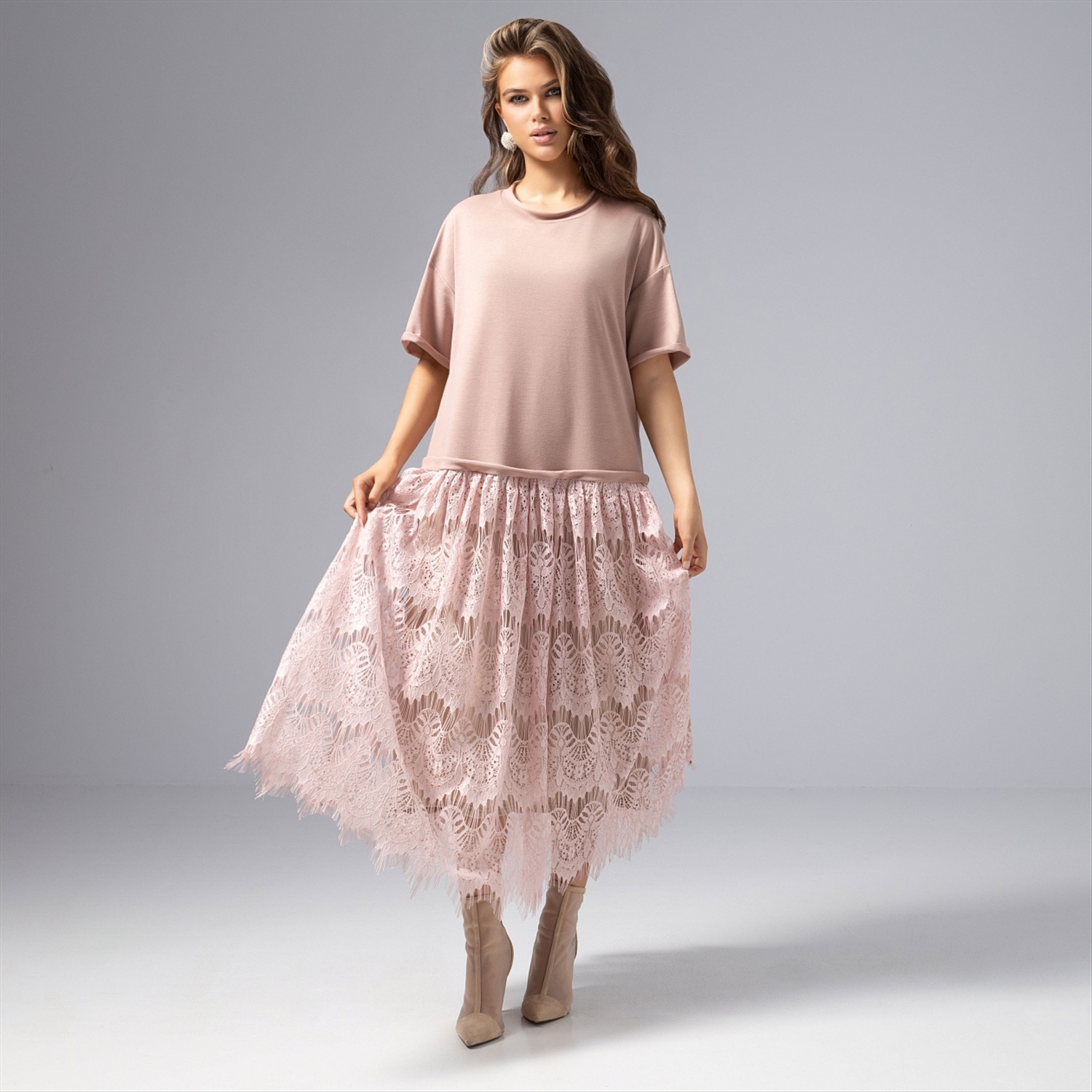 ТН ВЭД: 6104490000; Состав: Трикотаж «футер», кружево, трикотаж подклад (65% п/э, 30% хлопок, 5% спандекс); Плотность ткани: Средняя; Вид застежки: Нет; Декоративные элементы: Драпировка; Дополнительный цвет ткани: Бежевый; Карманы: Нет; Основной цвет ткани: Розовый; Отрезная талия: Нет; Подклад: Есть; Резинка по талии: Нет; Рисунок/раппорт: Нет, все изделия идентичны; Сезон: Круглогодичный; Силуэт: Свободный