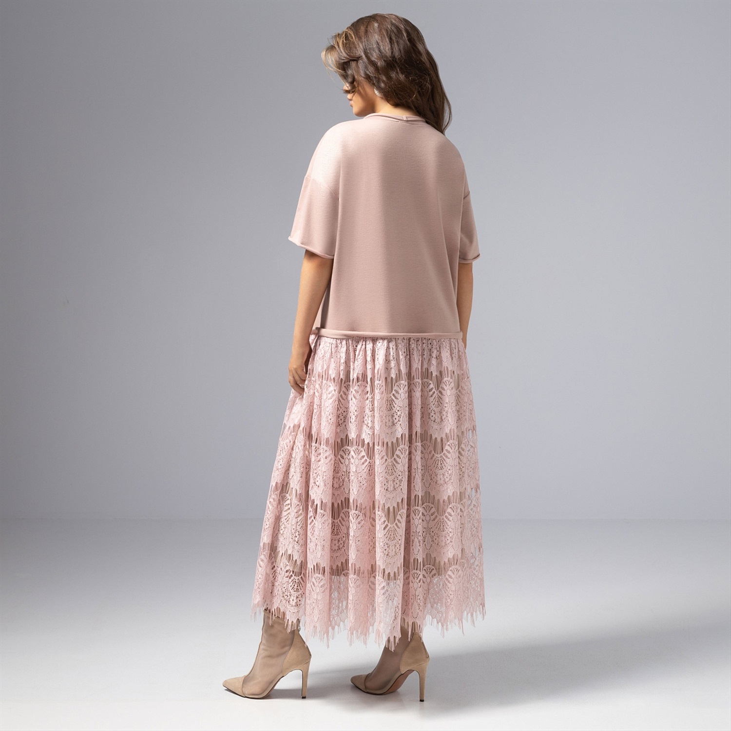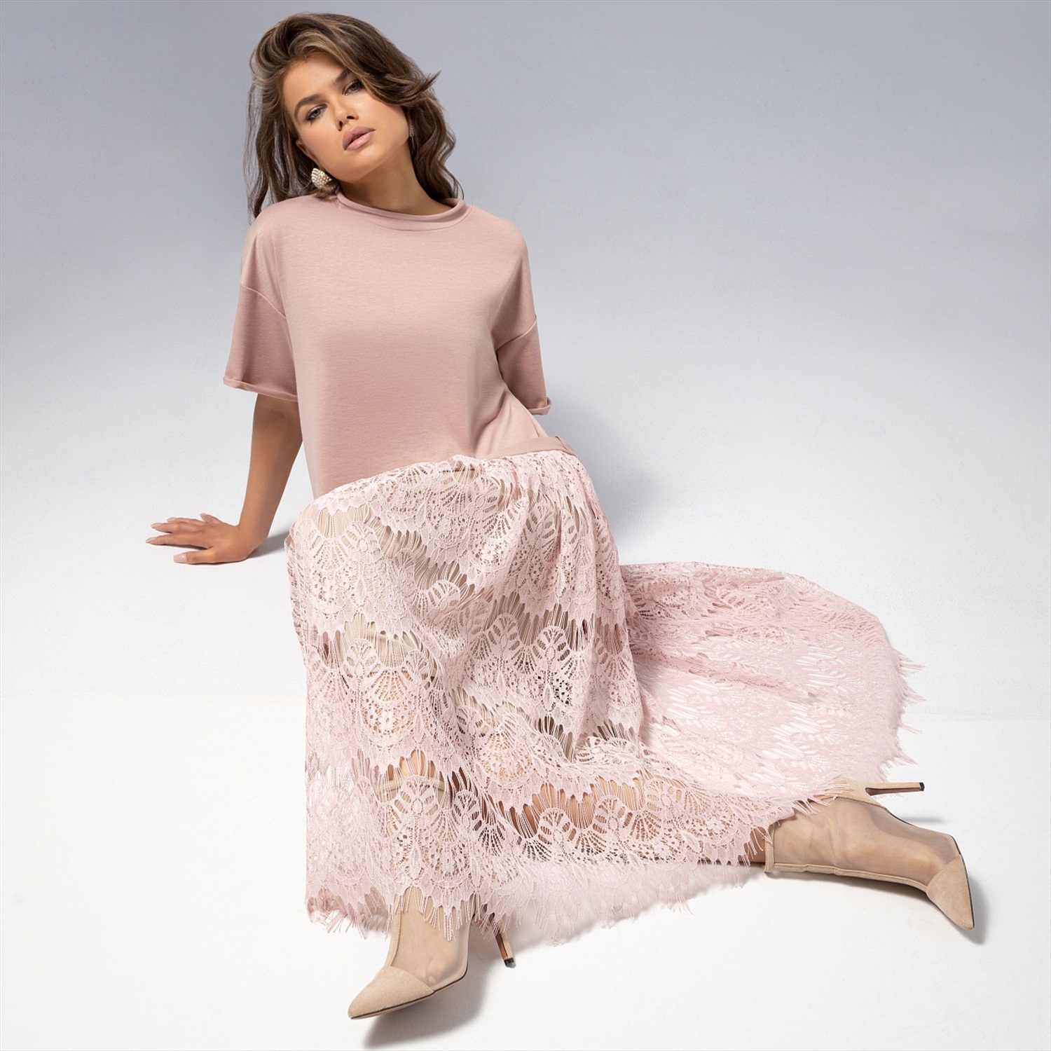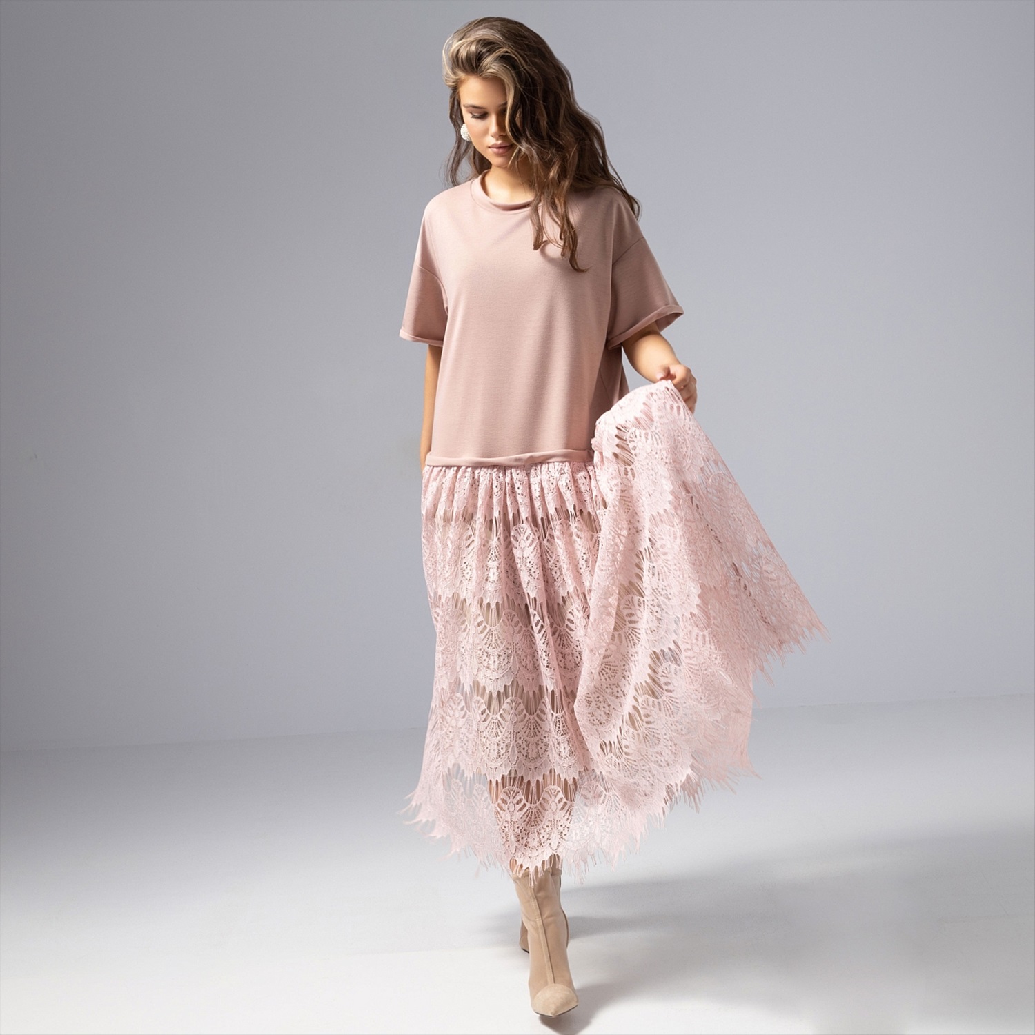 ТН ВЭД: 6104490000; Состав: Трикотаж «футер», кружево, трикотаж подклад (65% п/э, 30% хлопок, 5% спандекс); Плотность ткани: Средняя; Вид застежки: Нет; Декоративные элементы: Драпировка; Дополнительный цвет ткани: Бежевый; Карманы: Нет; Основной цвет ткани: Розовый; Отрезная талия: Нет; Подклад: Есть; Резинка по талии: Нет; Рисунок/раппорт: Нет, все изделия идентичны; Сезон: Круглогодичный; Силуэт: Свободный
