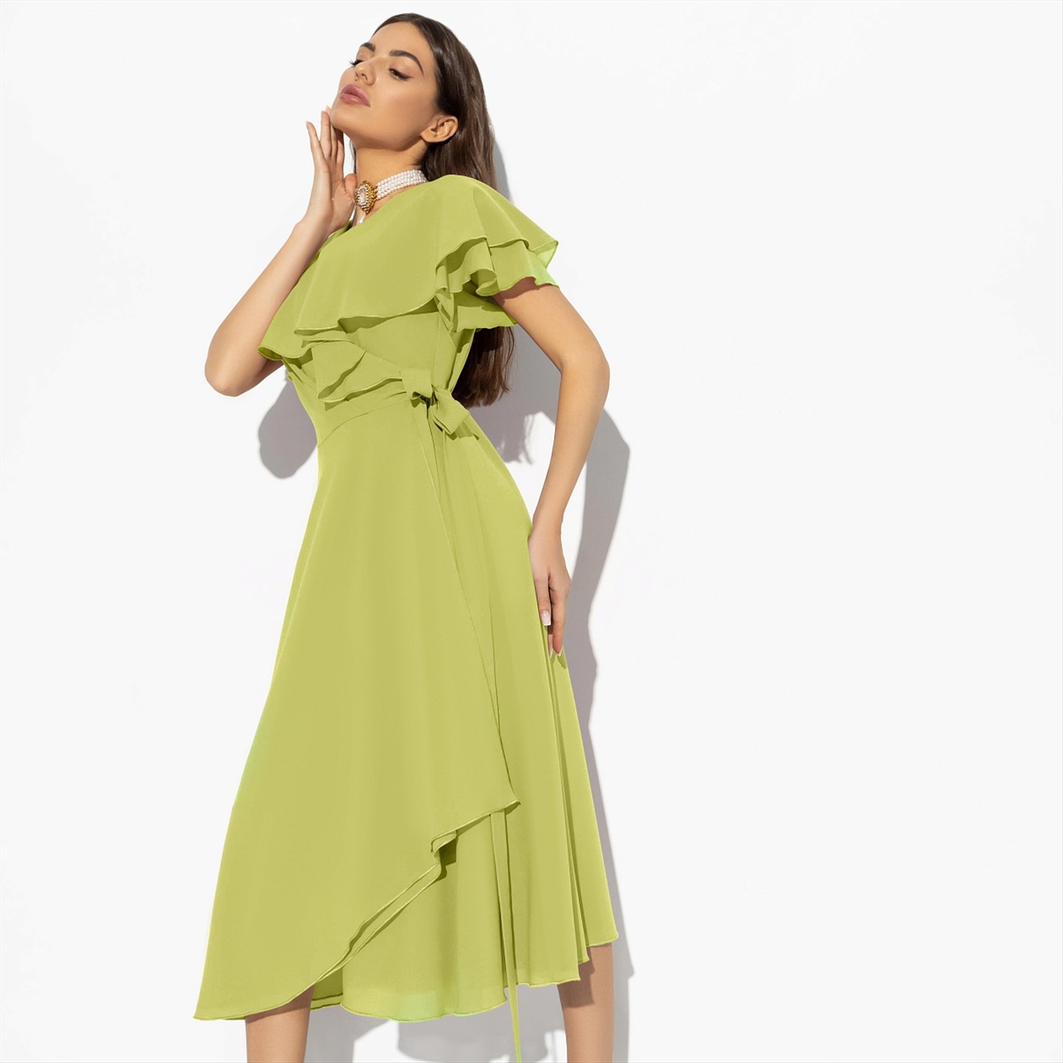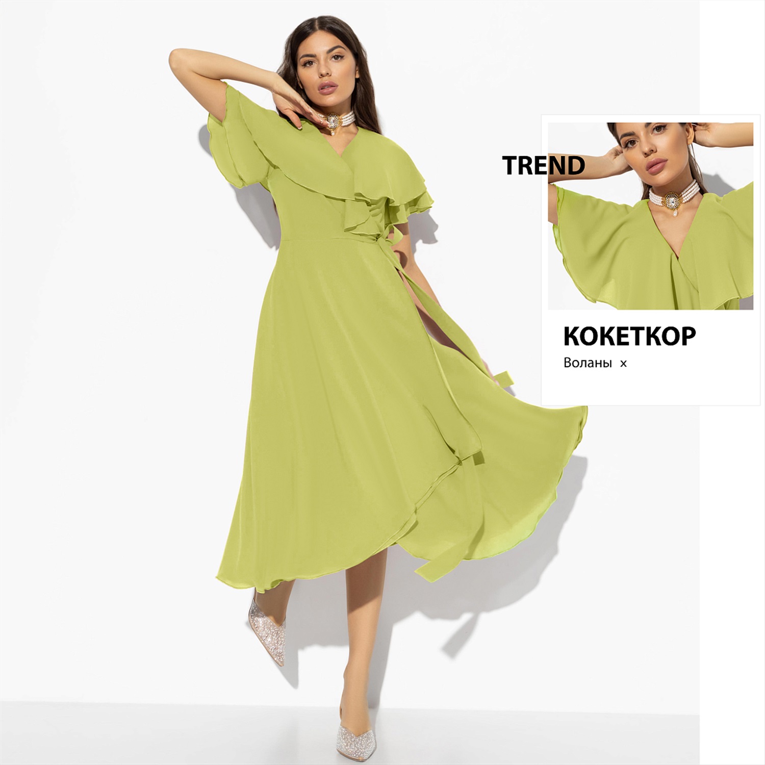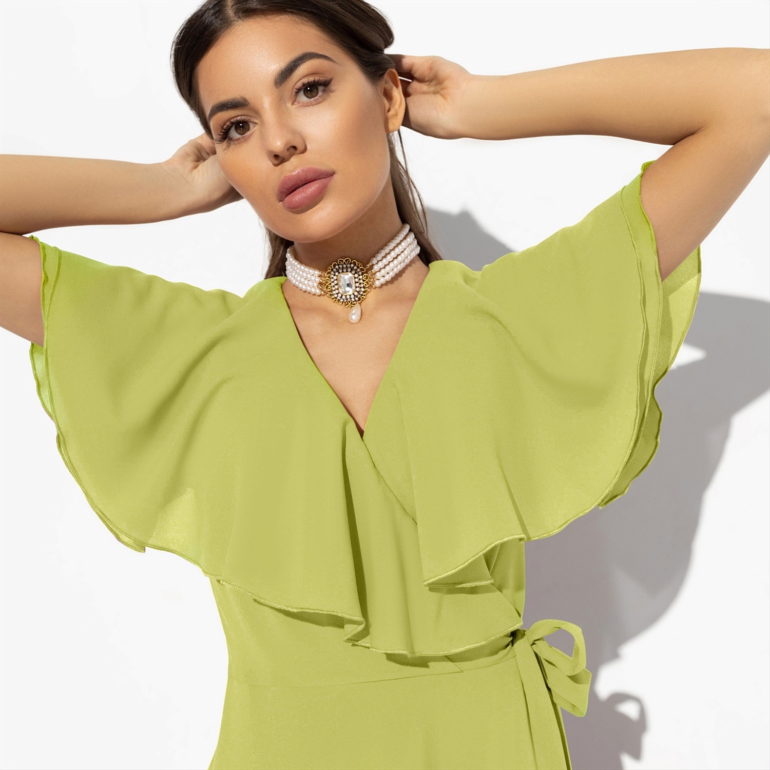 ТН ВЭД: 6204430000; Состав: «Креп-шифон» (98% п/э, 2% спандекс); Плотность ткани: Тонкая; Тип ткани: Текстиль; Вид застежки: Пояс на запах; Декоративные элементы: Воланы; Карманы: Нет; Основной цвет ткани: Зелёный; Отрезная талия: Есть; Подклад: Есть; Резинка по талии: Есть; Рисунок/раппорт: Нет, все изделия идентичны; Сезон: Лето; Силуэт: Приталенный; Стиль: Повседневный