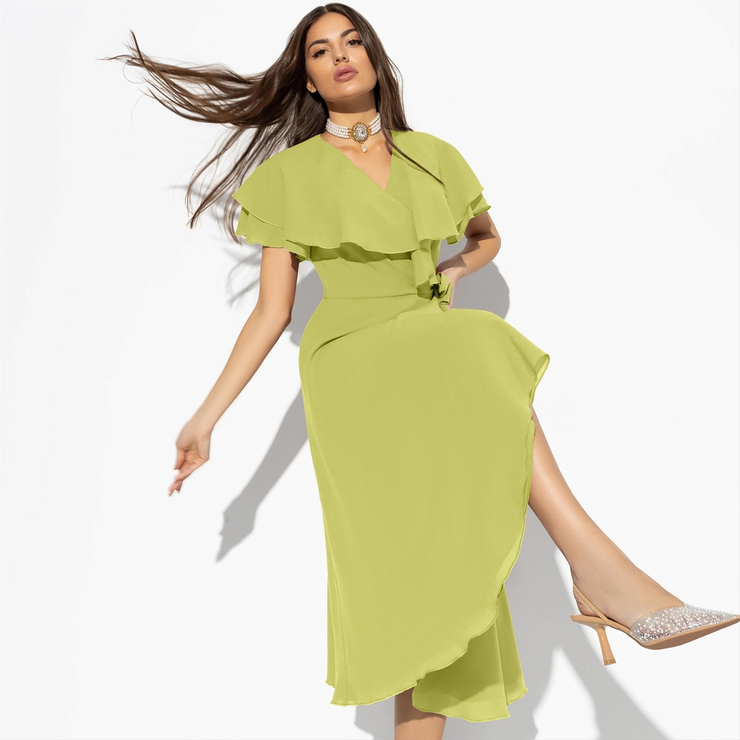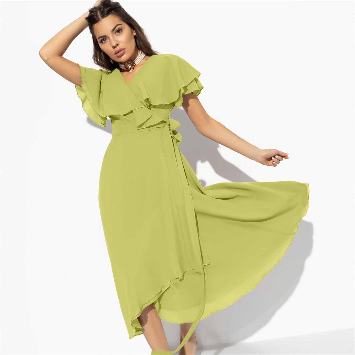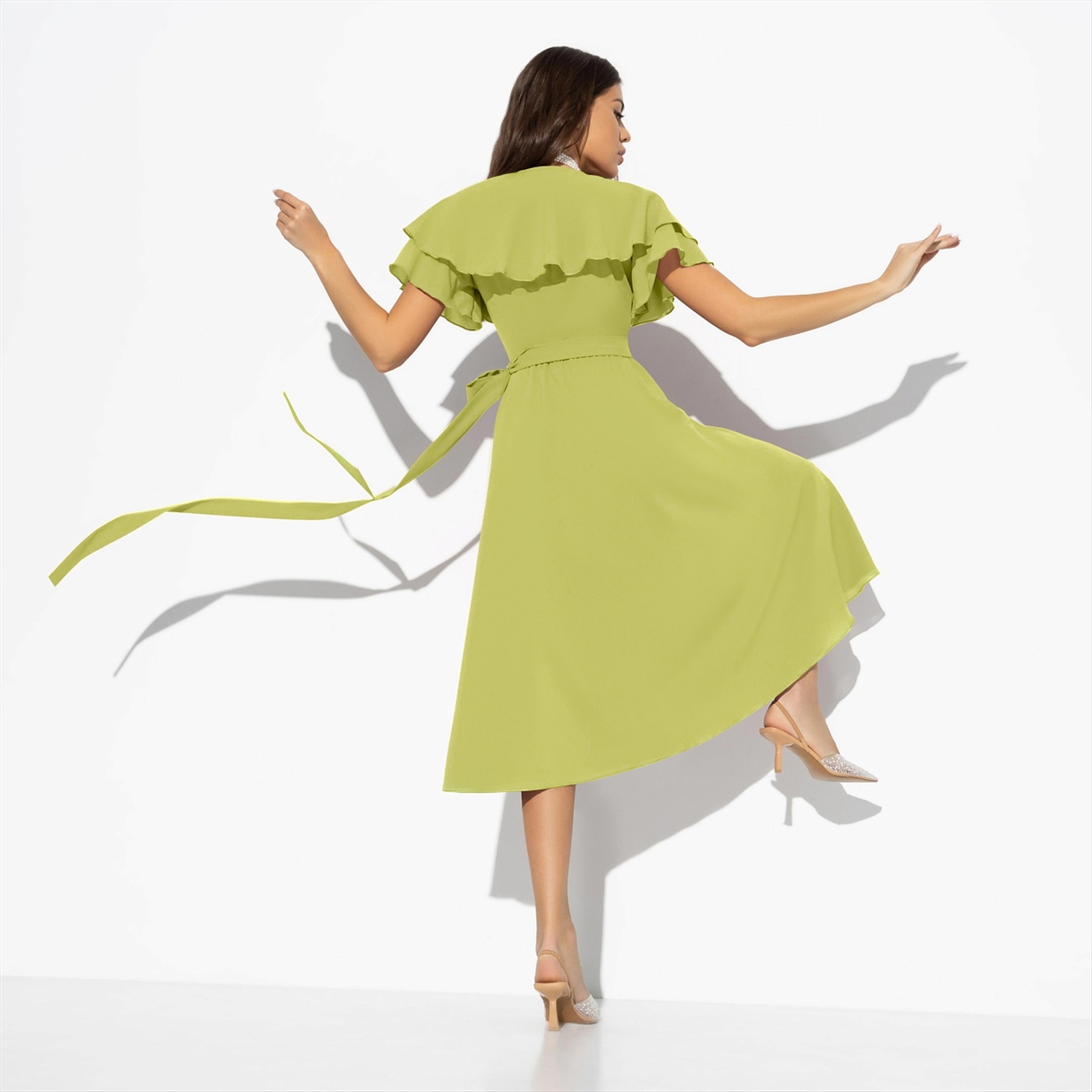 ТН ВЭД: 6204430000; Состав: «Креп-шифон» (98% п/э, 2% спандекс); Плотность ткани: Тонкая; Тип ткани: Текстиль; Вид застежки: Пояс на запах; Декоративные элементы: Воланы; Карманы: Нет; Основной цвет ткани: Зелёный; Отрезная талия: Есть; Подклад: Есть; Резинка по талии: Есть; Рисунок/раппорт: Нет, все изделия идентичны; Сезон: Лето; Силуэт: Приталенный; Стиль: Повседневный