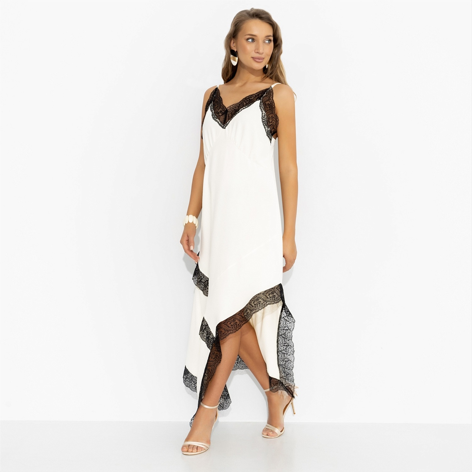 ТН ВЭД: 6204430000; Состав: «Дорна» (100% п/э); Плотность ткани: Средняя; Тип ткани: Текстиль; Вид застежки: Нет; Дополнительный цвет ткани: Черный; Карманы: Нет; Основной цвет ткани: Молочный; Отрезная талия: Нет; Подклад: Нет; Резинка по талии: Нет; Рисунок/раппорт: Нет, все изделия идентичны; Сезон: Круглогодичный; Силуэт: Прямой; Стиль: Бельевой