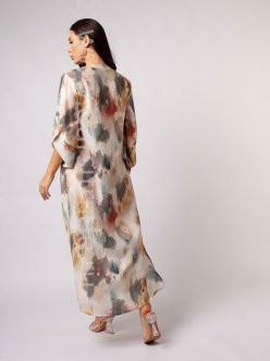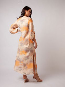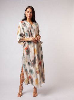 Материал: 80% вискоза, 20% нейлон Платье макси, свободного силуета, боковые разрезы добавляют образу лёгкость, а V-образный вырез подчёркивает женственность. Втачной длинный рукав в форме "тюльпанчика". Горловина и низ рукава декорированы планкой. Принт - пастельный адрес придает восточный колорит и нежность всему изделию. Комментарии к товару