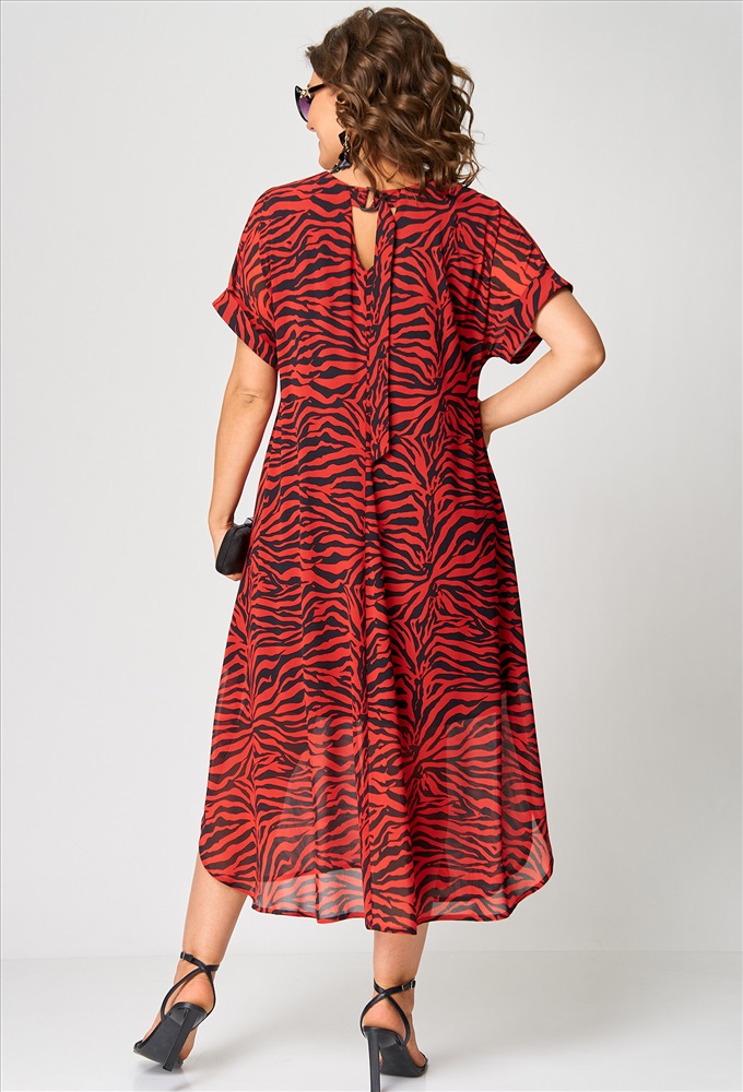 Платье женское нарядно-повседневное полуприлегающего силуэта расширенное к низу на подкладке. Выполнено из шифона. Подкладка трикотажная. Вырез горловины V-образный на обтачке, рукав спущенный по низу на притачной манжете. Низ фигурный. В боковых швах обработаны разрезы. Горловина спинки с фигурным вырезом и пряжкой. Декором платья служит дизайн самой ткани.