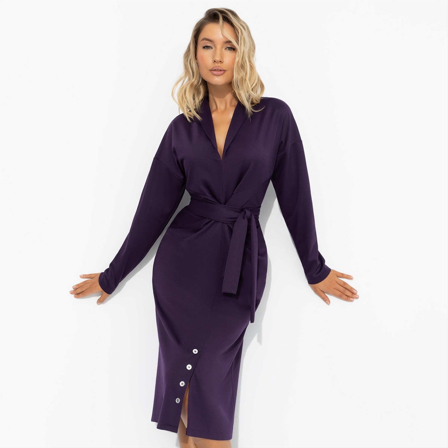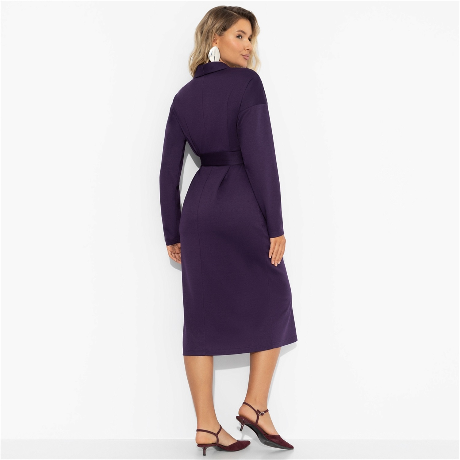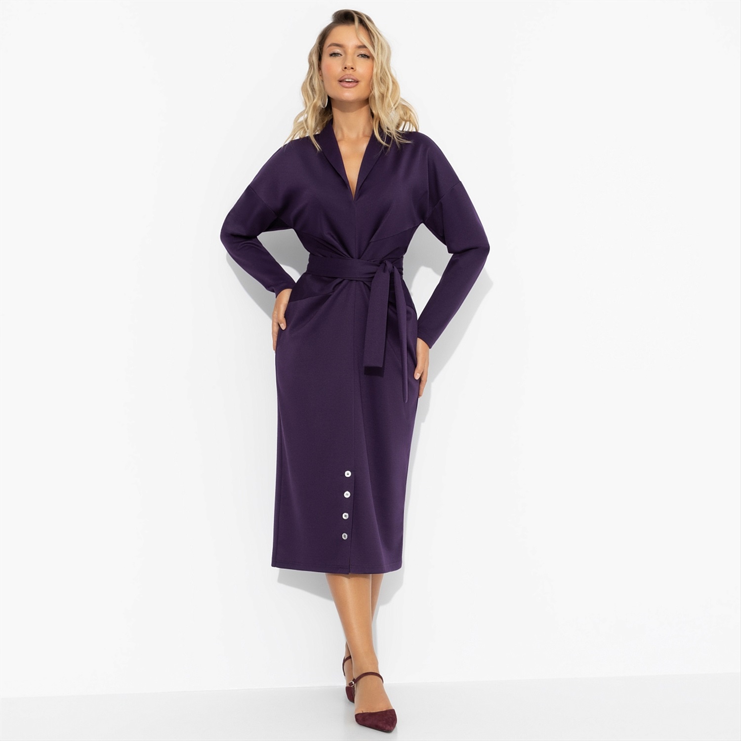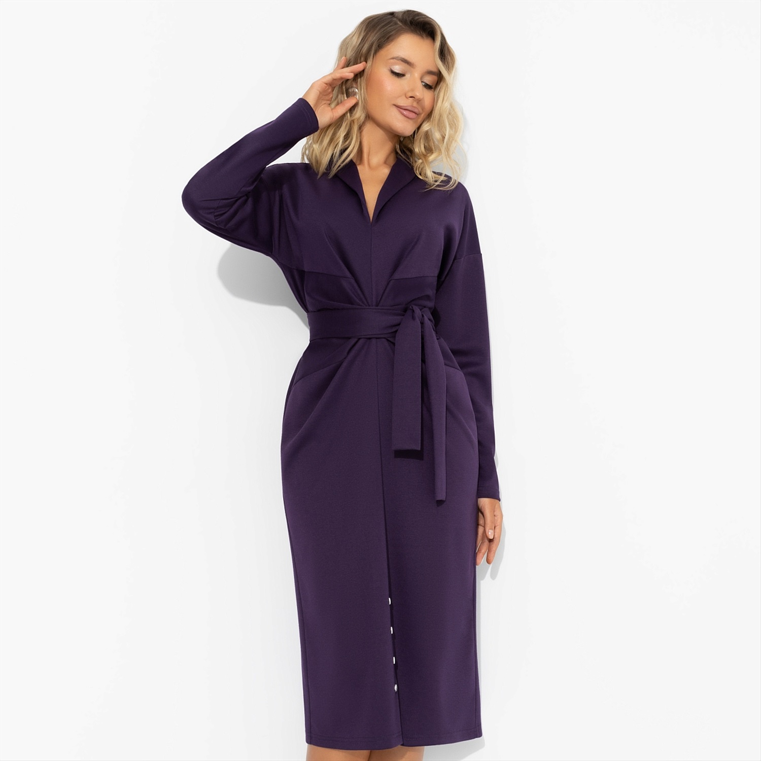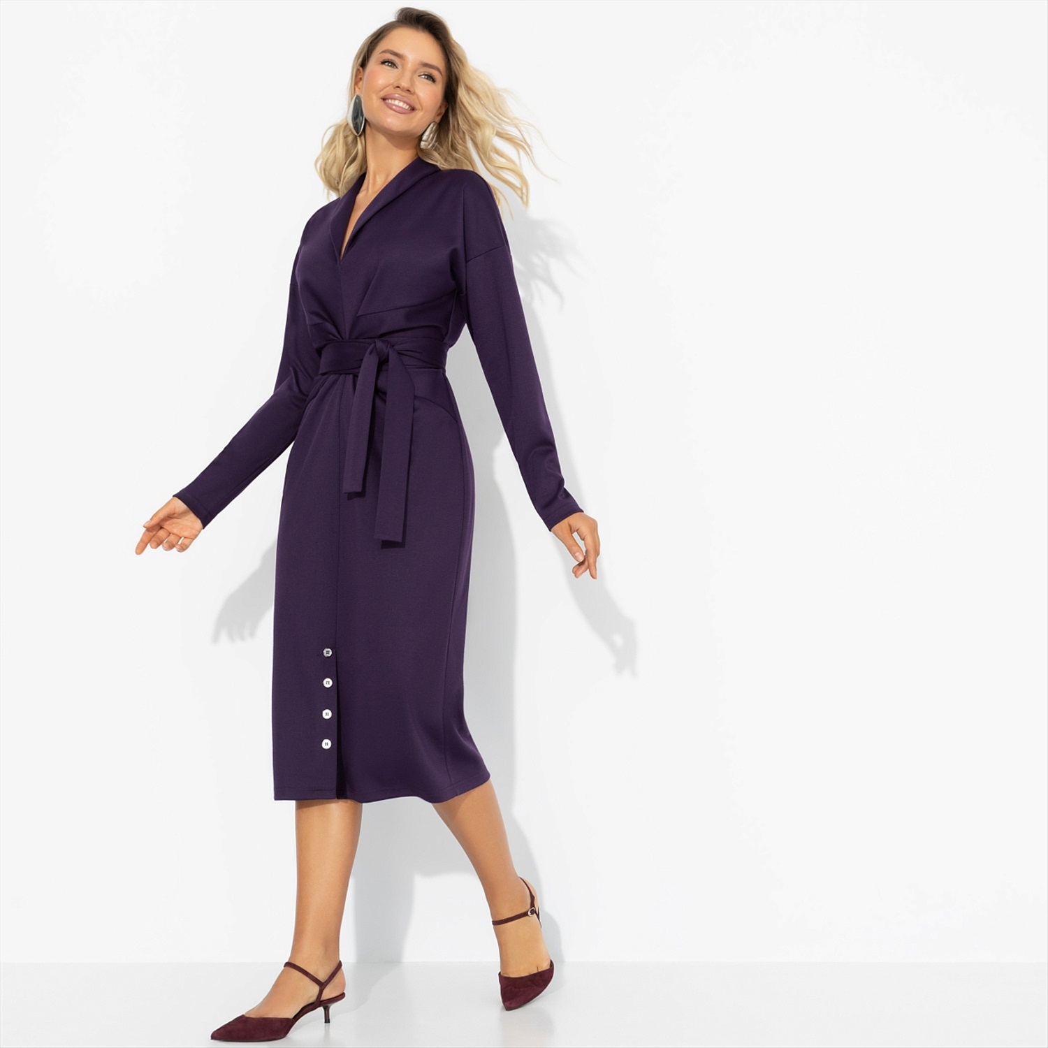 ТН ВЭД: 6104430000; Состав: «Трикотаж лакоста» (65% полиэстер, 30% вискоза, 5% спандекс); Плотность ткани: Плотная; Тип ткани: Трикотаж; Вид застежки: Нет; Декоративные элементы: Драпировка; Дополнительный цвет ткани: Нет; Карманы: Нет; Основной цвет ткани: Фиолетовый; Отрезная талия: Нет; Подклад: Нет; Резинка по талии: Нет; Рисунок/раппорт: Нет, все изделия идентичны; Сезон: Зима; Силуэт: Прямой
