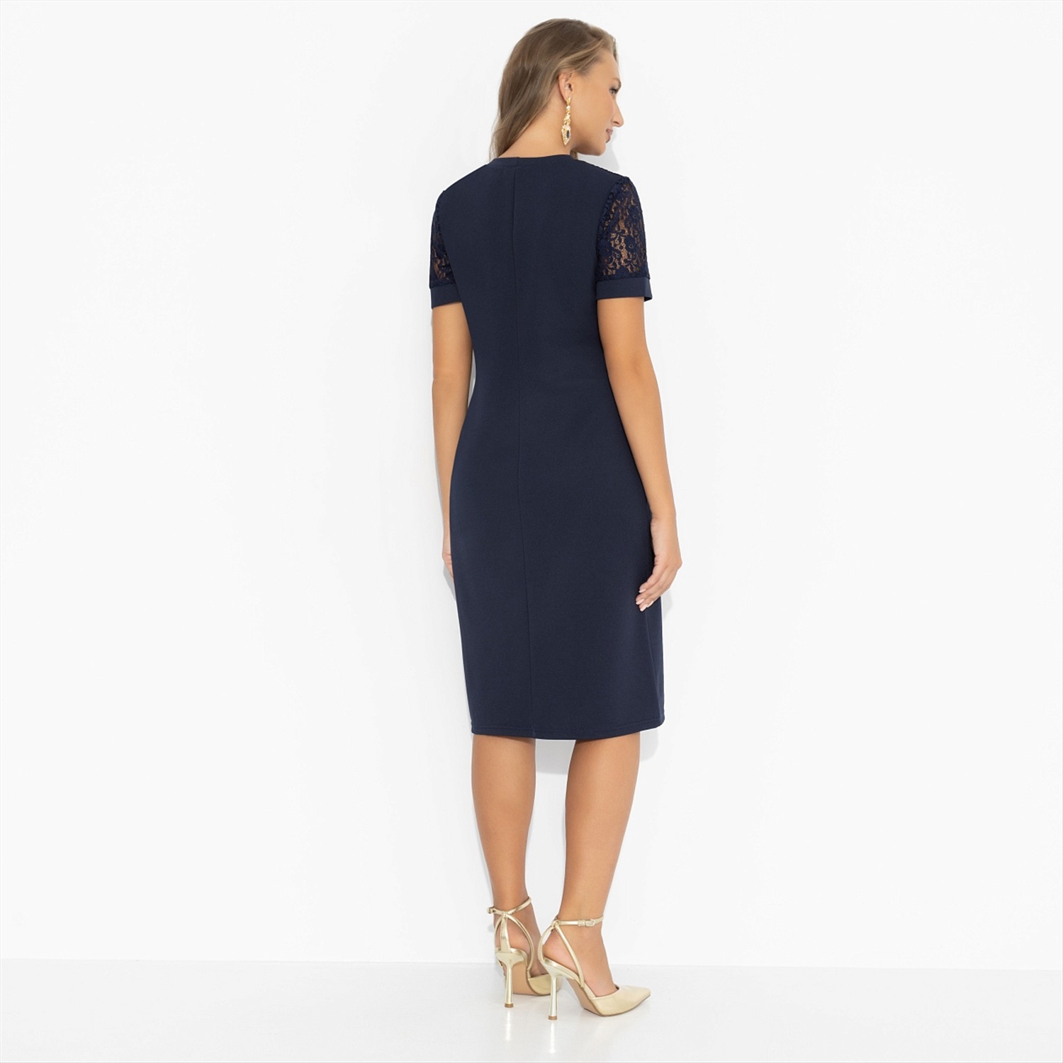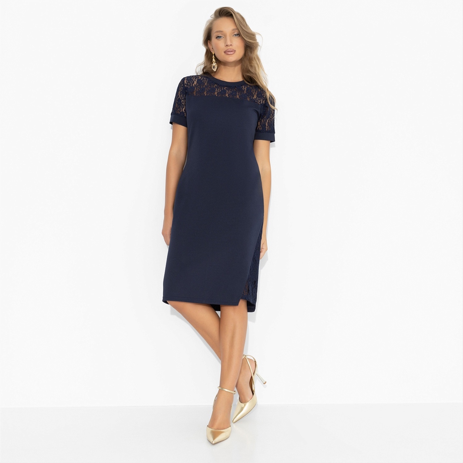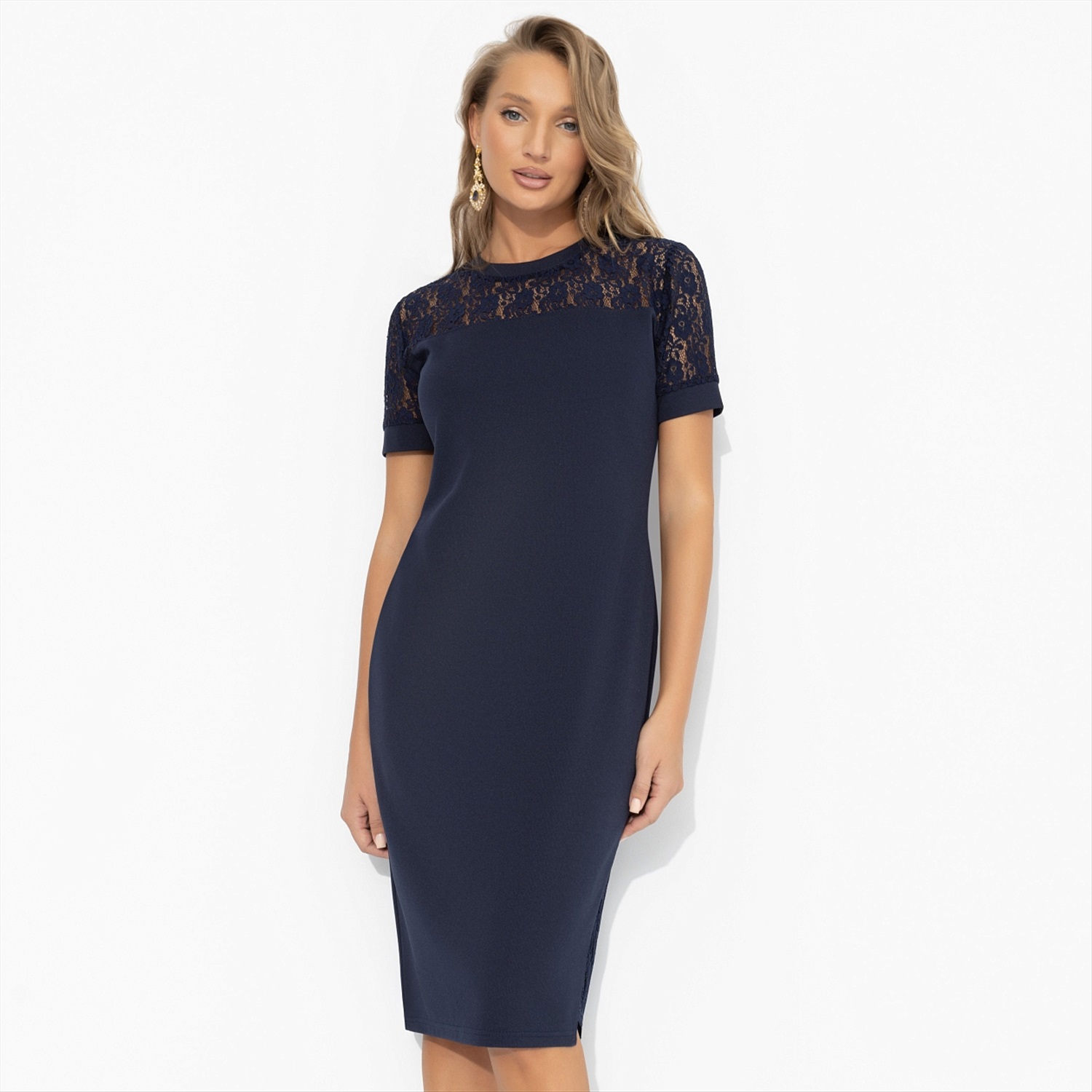 ТН ВЭД: 6204430000; Состав: «Диор», «гипюр-стрейч» (95% п/э, 5% эластан); Плотность ткани: Средняя; Тип ткани: Трикотаж; Вид застежки: Нет; Карманы: Нет; Основной цвет ткани: Синий; Отрезная талия: Нет; Подклад: Нет; Резинка по талии: Нет; Рисунок/раппорт: Нет, все изделия идентичны; Сезон: Круглогодичный; Силуэт: Приталенный; Стиль: Повседневный