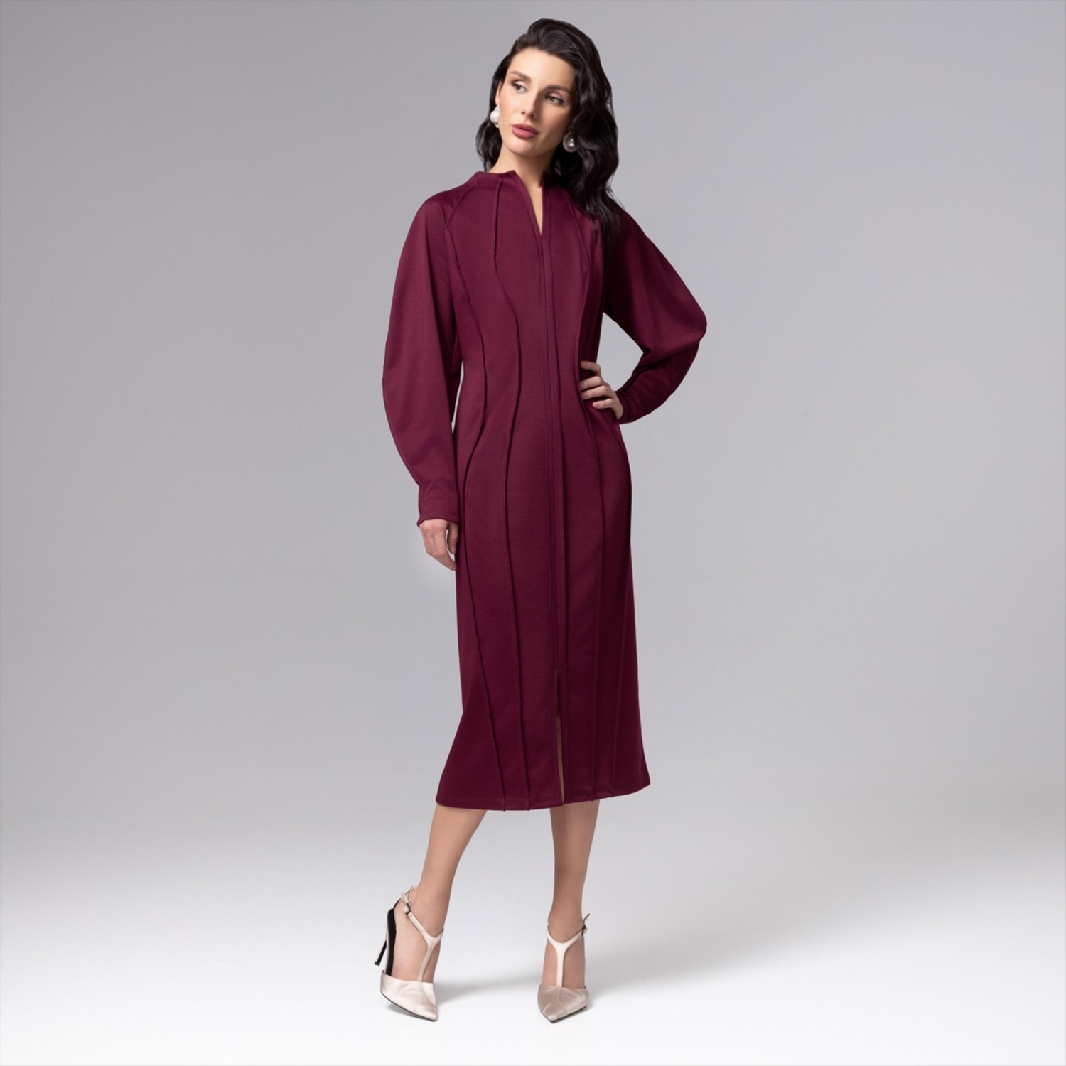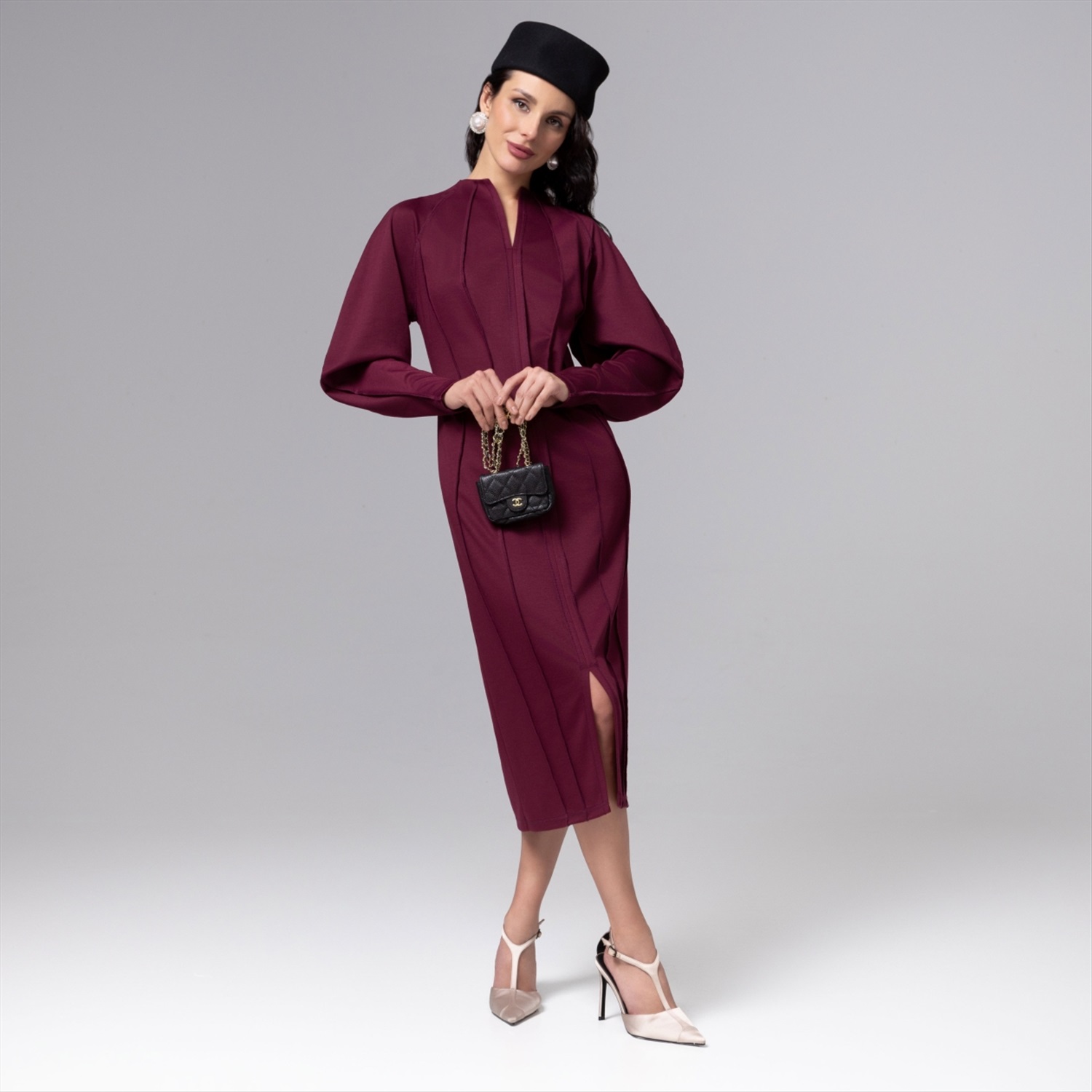 Платье коллекции PREMIUM полуприлегающего силуэта в роскошном цвете бордо воплощает современную элегантность с акцентом на безупречную конструкцию. Трендовые внешние швы не только подчеркивают изящные линии фигуры, но и выступают художественным элементом, добавляя образу выразительности. Идеальный пошив проявляется в точном соблюдении пропорций, безукоризненной стыковке деталей и использовании технологии, обеспечивающей идеальную посадку без скованности движений.