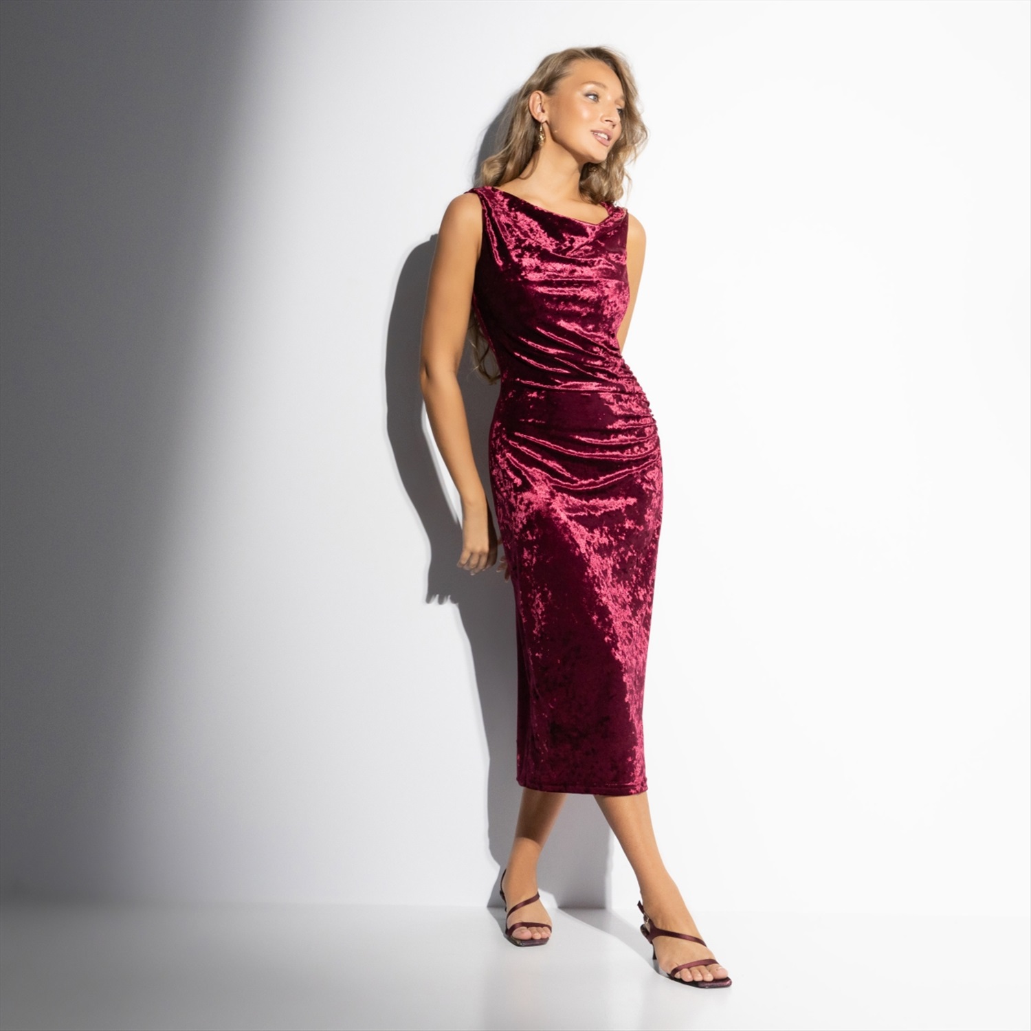 «На первом плане» – платье, которое говорит без слов. Мраморный бархат, оттенок бордо, идеальный силуэт, созданный, чтобы влюблять. Это платье не просто подчёркивает фигуру – оно подчёркивает уверенность. Платье для особых случаев, таких, например, как Новогодняя ночь. Эффектные драпировки, женственная длина миди. Образ, в котором все желания исполняются.