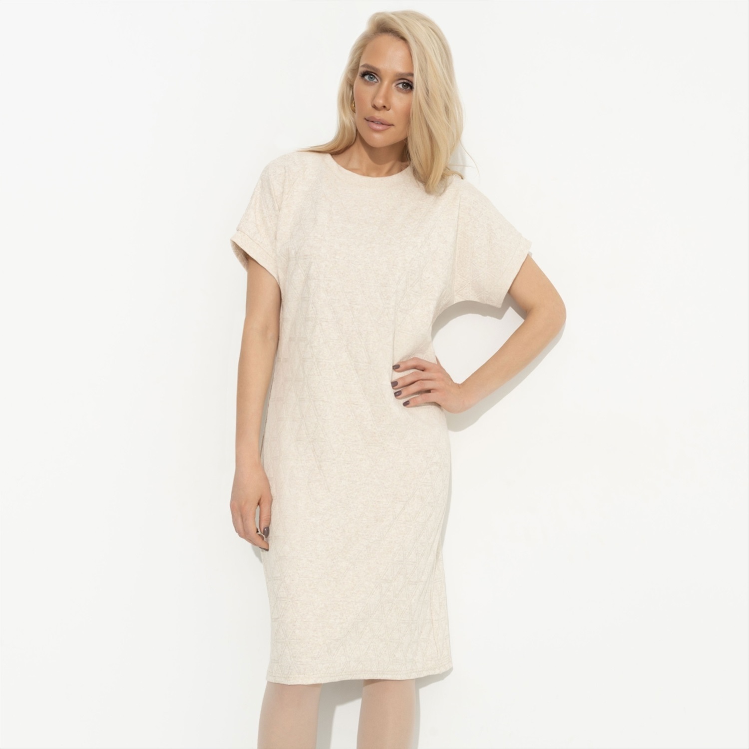ТН ВЭД: 6104430000; Состав: Трикотаж «жаккард» (70% вискоза, 25% п/э, 5% спандекс); Плотность ткани: Средняя; Тип ткани: Трикотаж; Вид застежки: Нет; Карманы: Нет; Основной цвет ткани: Бежевый; Отрезная талия: Нет; Подклад: Нет; Резинка по талии: Нет; Рисунок/раппорт: Нет, все изделия идентичны; Сезон: Круглогодичный; Силуэт: Приталенный; Стиль: Повседневный
