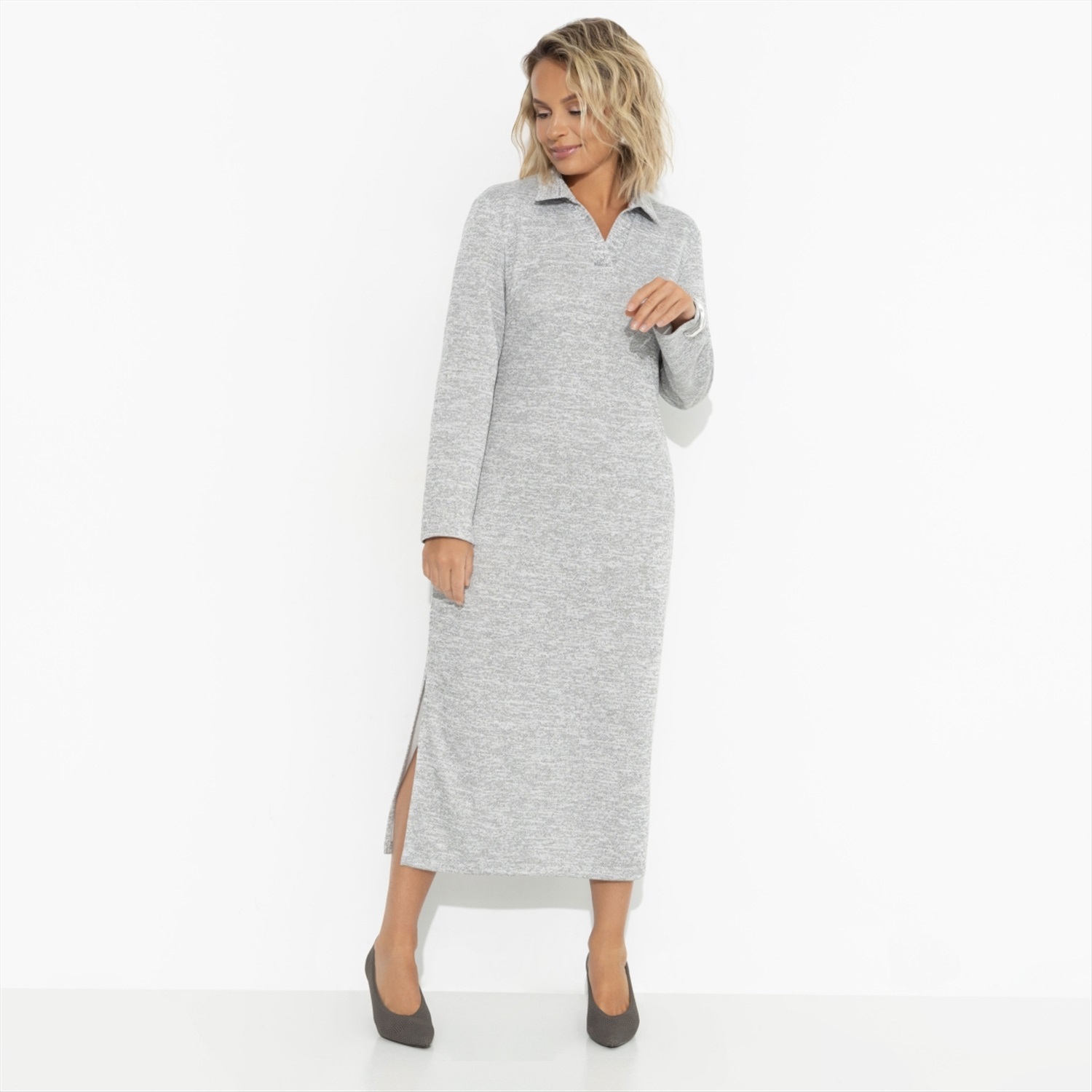 Вот это находка! Редкий экземпляр – минималистичное платье в цвете серый меланж. Стиль casual в прочтении CHARUTTI. Женственное или комфортное, смотря с какой обувью подать. Такое нельзя упускать. Платье прямого силуэта в длине миди. Цвет ткани неоднородный. Воротник в стиле поло. Есть карманы. Разрезы по боковым швам. Благодаря крою изделие хорошо смотрится на любом типе фигуры.