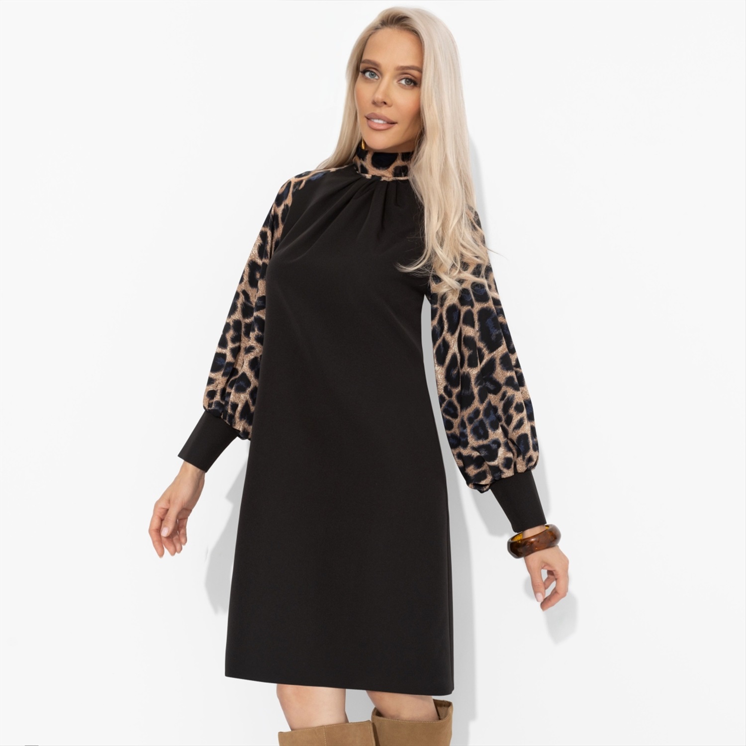 Платье ЧАРУТТИ было её доспехами – чёрная основа, строгая и серьёзная, и дикий леопардовый принт на рукавах, как символ побед. В платье она шла на переговоры, зная, что чёрный цвет внушает уважение, а животный принт предупреждает: с ней шутки плохи. Это история ЧАРУТТИ о том, как роскошь и воля создают уникальный образ. Платье трапециевидного силуэта в длине до колена. Рукава акцентного материала с трендовым принтом. Платье хорошо смотрится на любом типе фигуры. Воротник-стойка сзади оформлен бантом.