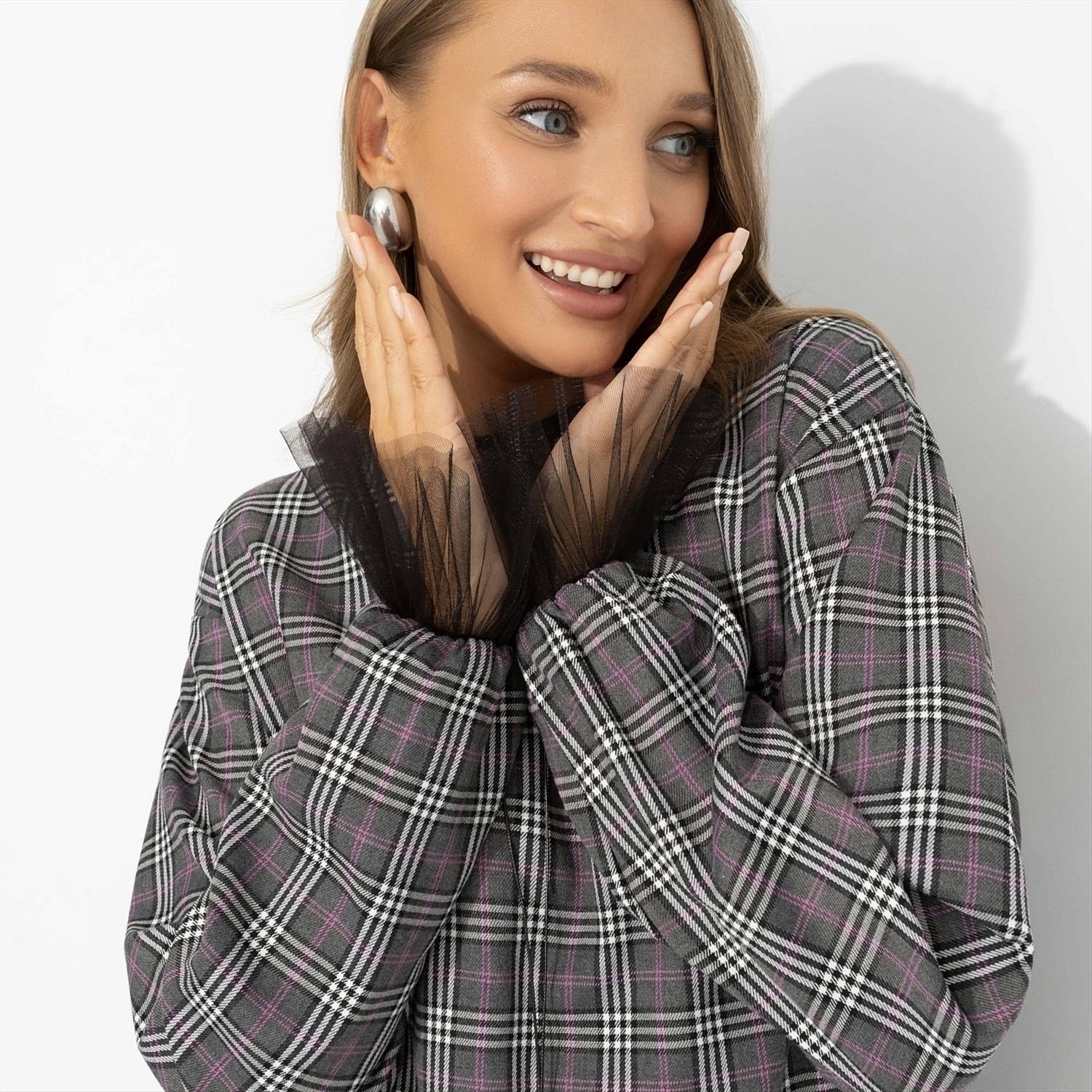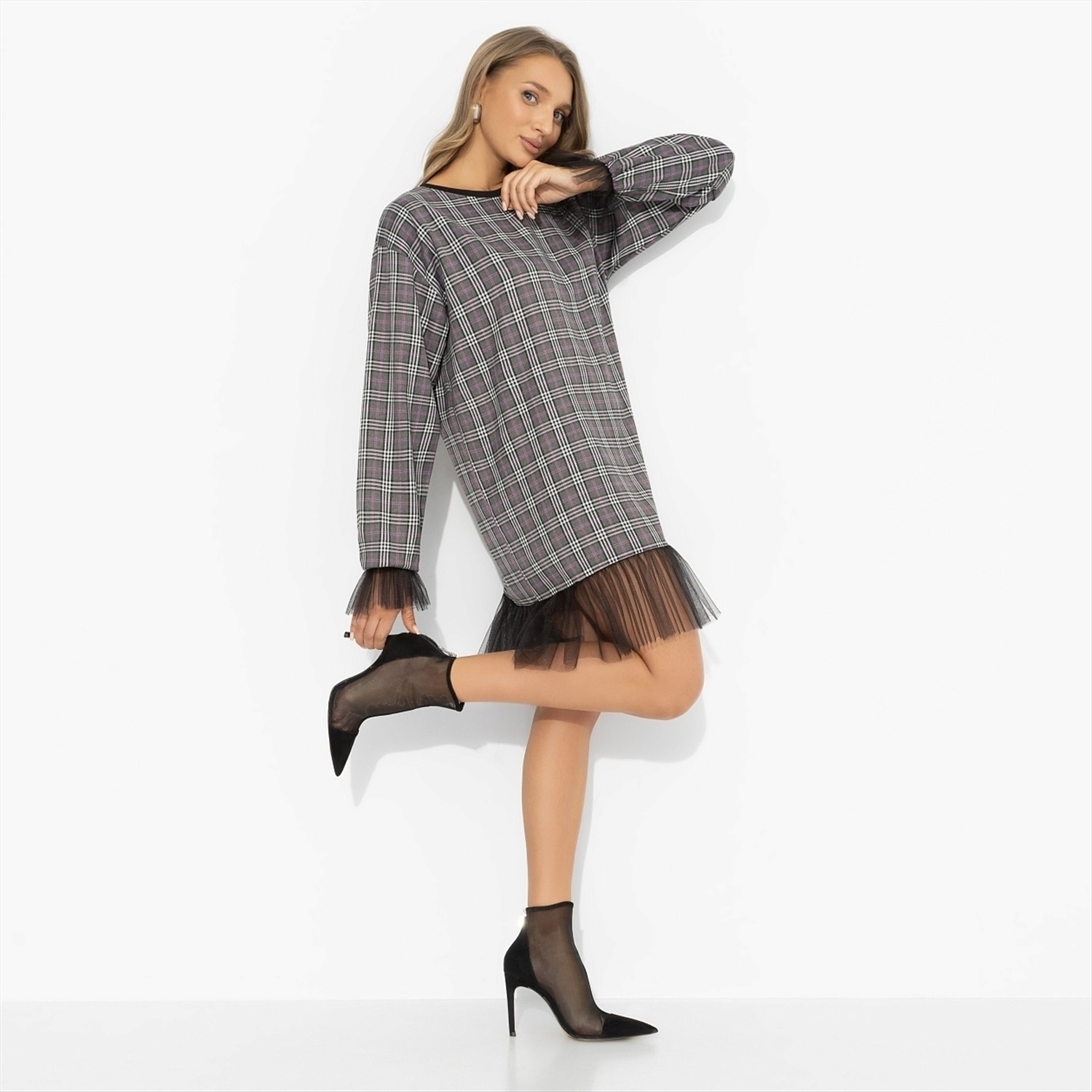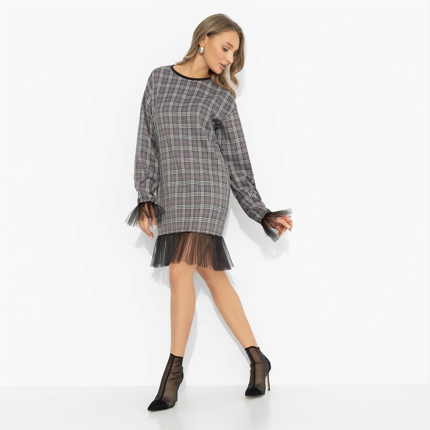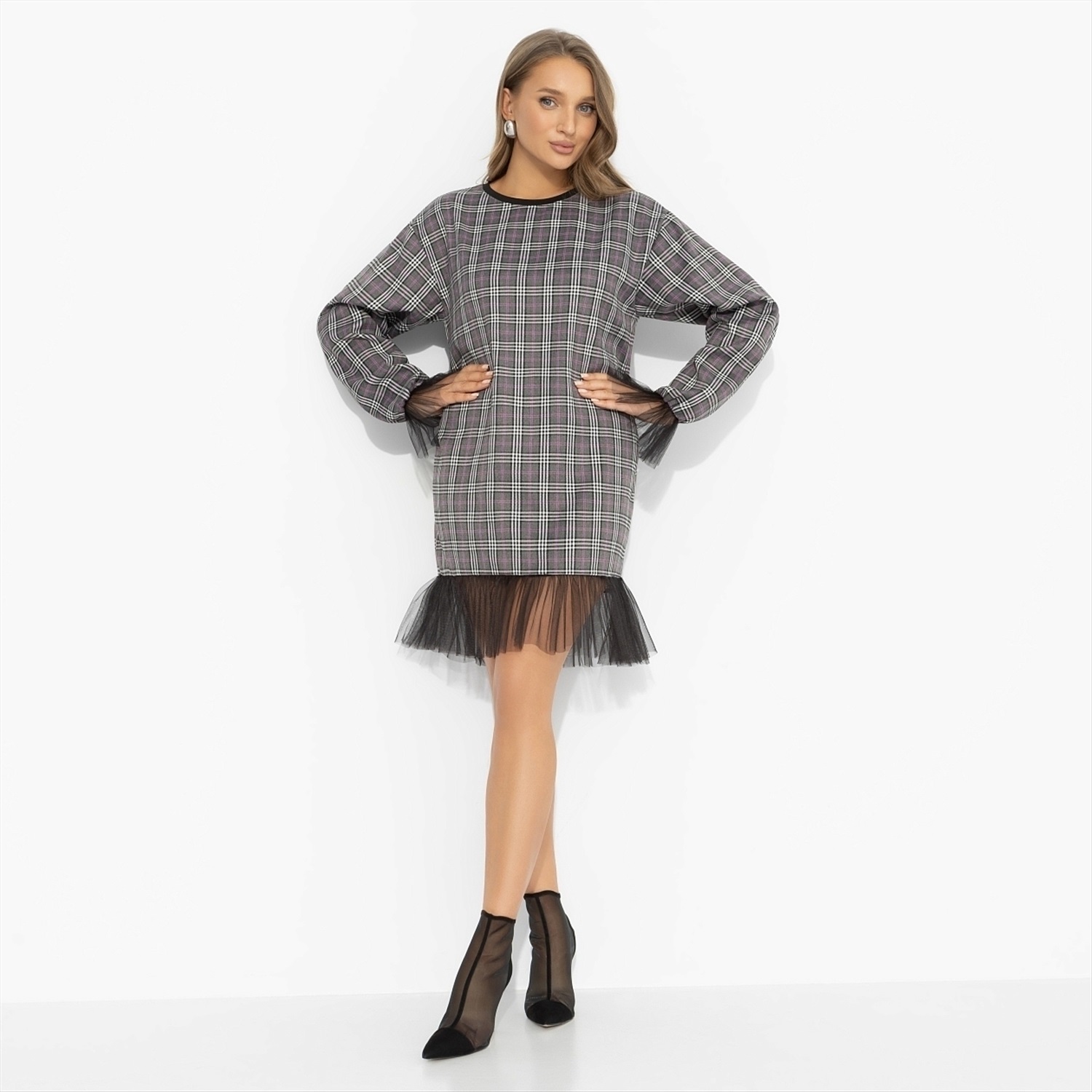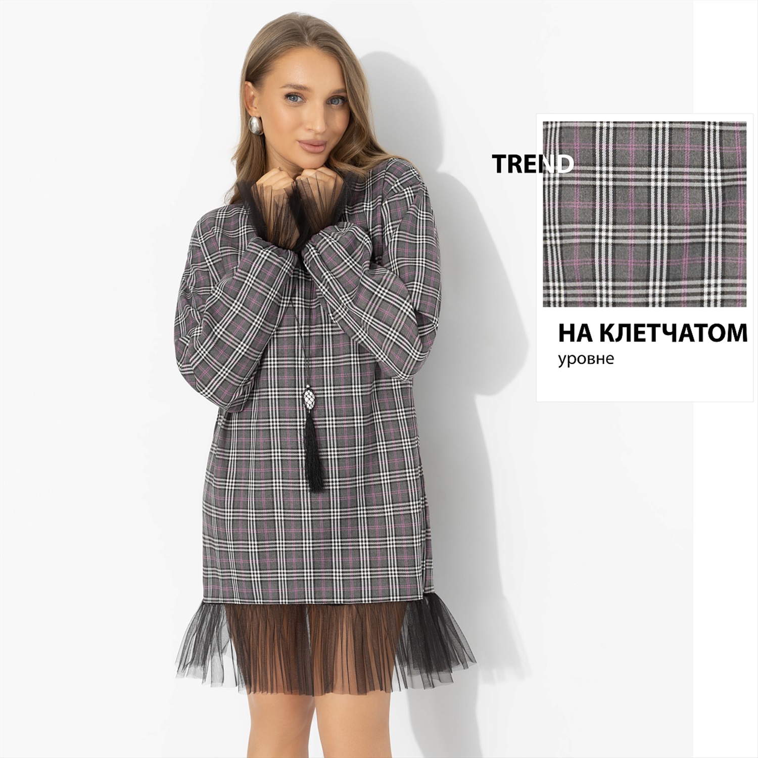 Срочные модные новости: платье «Вне формата» ломает привычные сценарии. Трендовая клетка встречается с игривой сеткой: надела, вышла, собрала восхищенные взгляды – план выполнен. Стиль Вивьен Вествуд. Платье свободного силуэта из костюмной ткани с хлопком. Драматизма добавляют объемные рукава. Длина выше колена, комфортная посадка, платье отлично держит форму и выглядит аккуратно весь день.