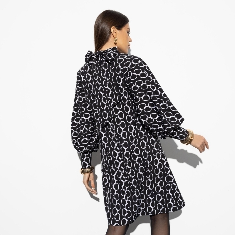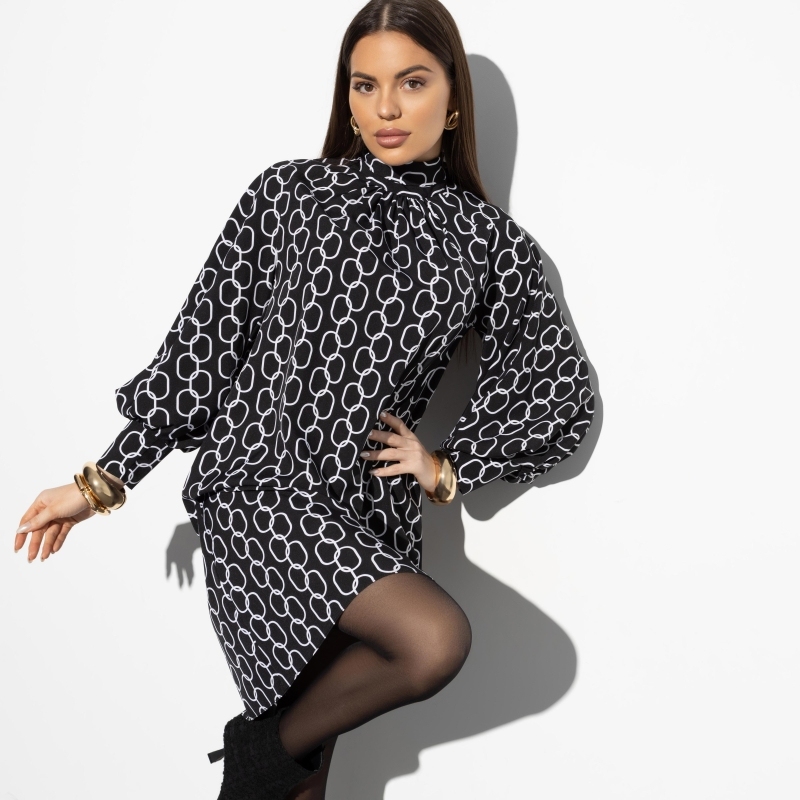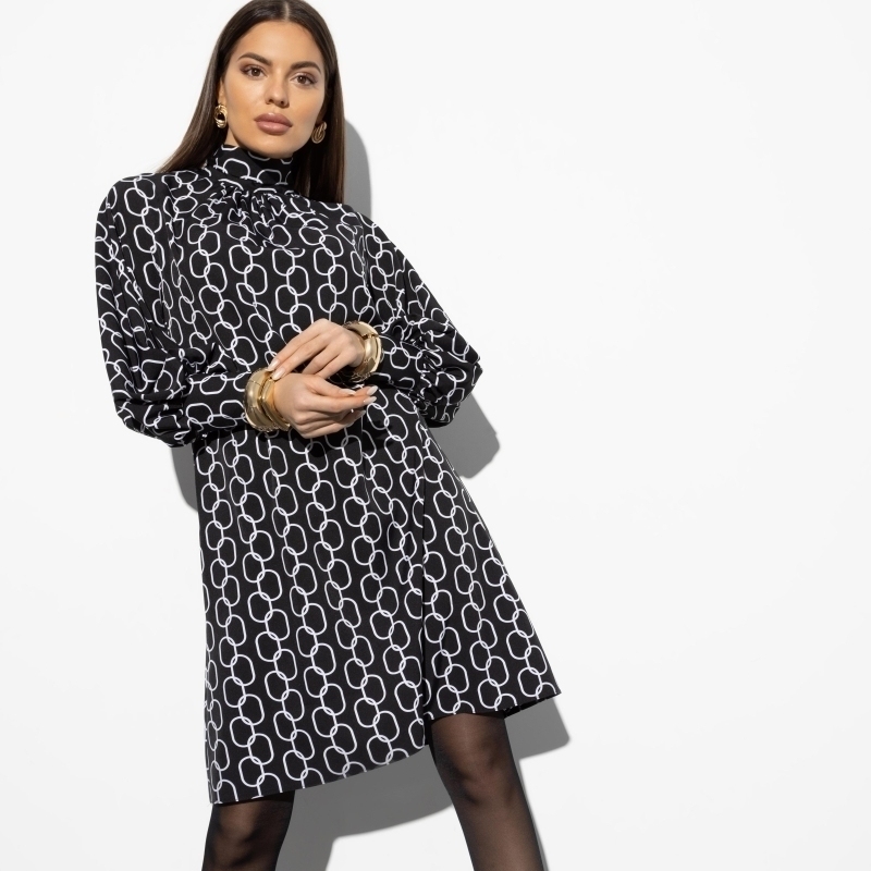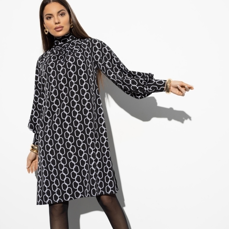 ТН ВЭД: 6204430000; Состав: «Ниагара» (95% п/э, 5% эластан); Плотность ткани: Тонкая; Тип ткани: Текстиль; Вид застежки: Нет; Дополнительный цвет ткани: Белый; Карманы: Нет; Основной цвет ткани: Черный; Отрезная талия: Нет; Подклад: Нет; Резинка по талии: Нет; Рисунок/раппорт: Каждое изделие уникально из-за расположения рисунка на ткани; Сезон: Круглогодичный