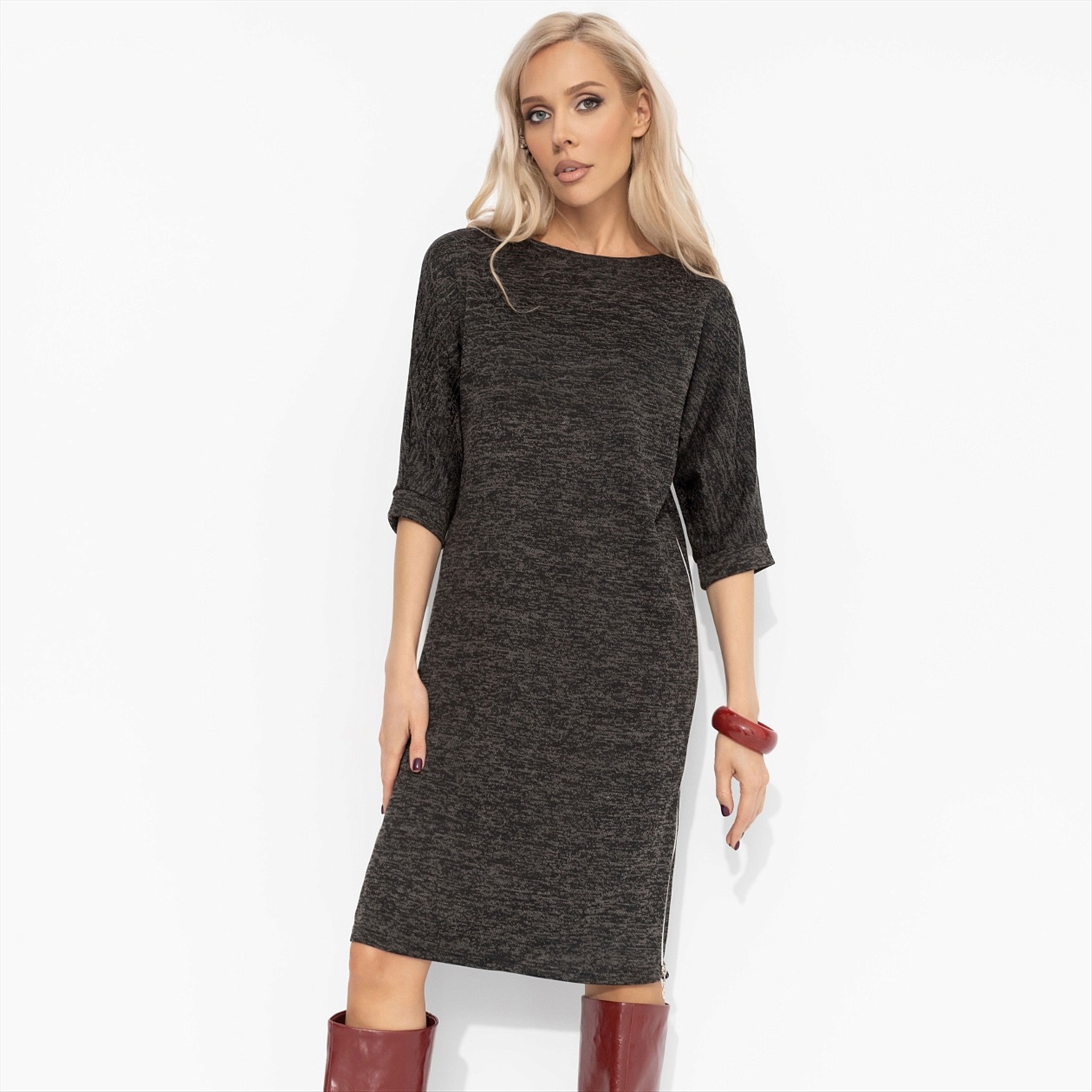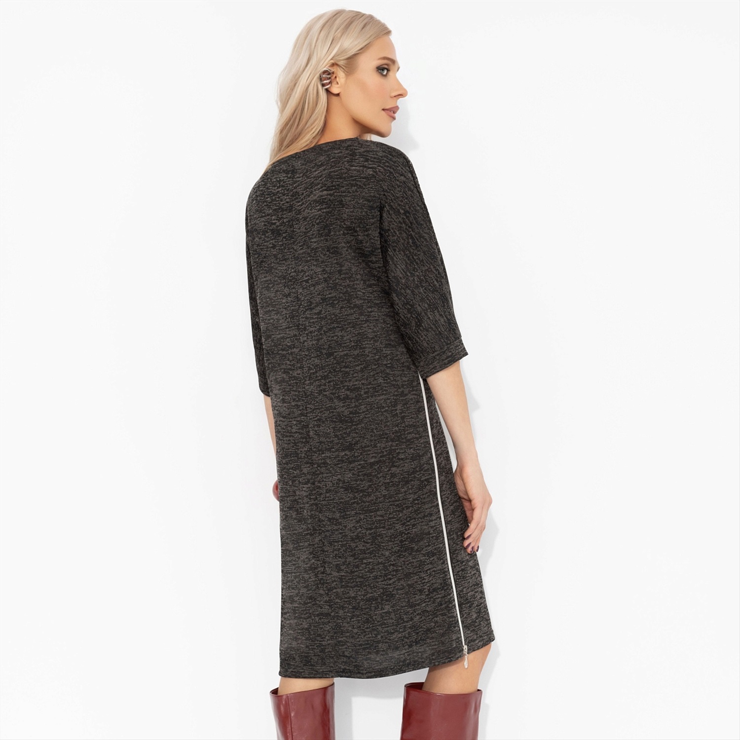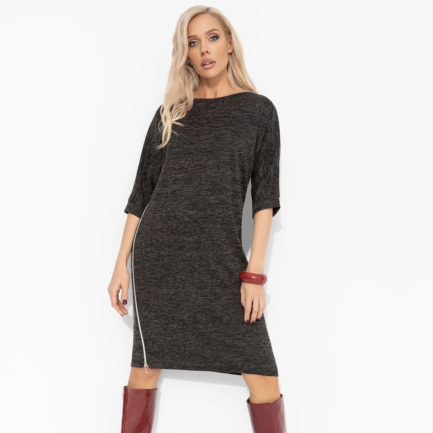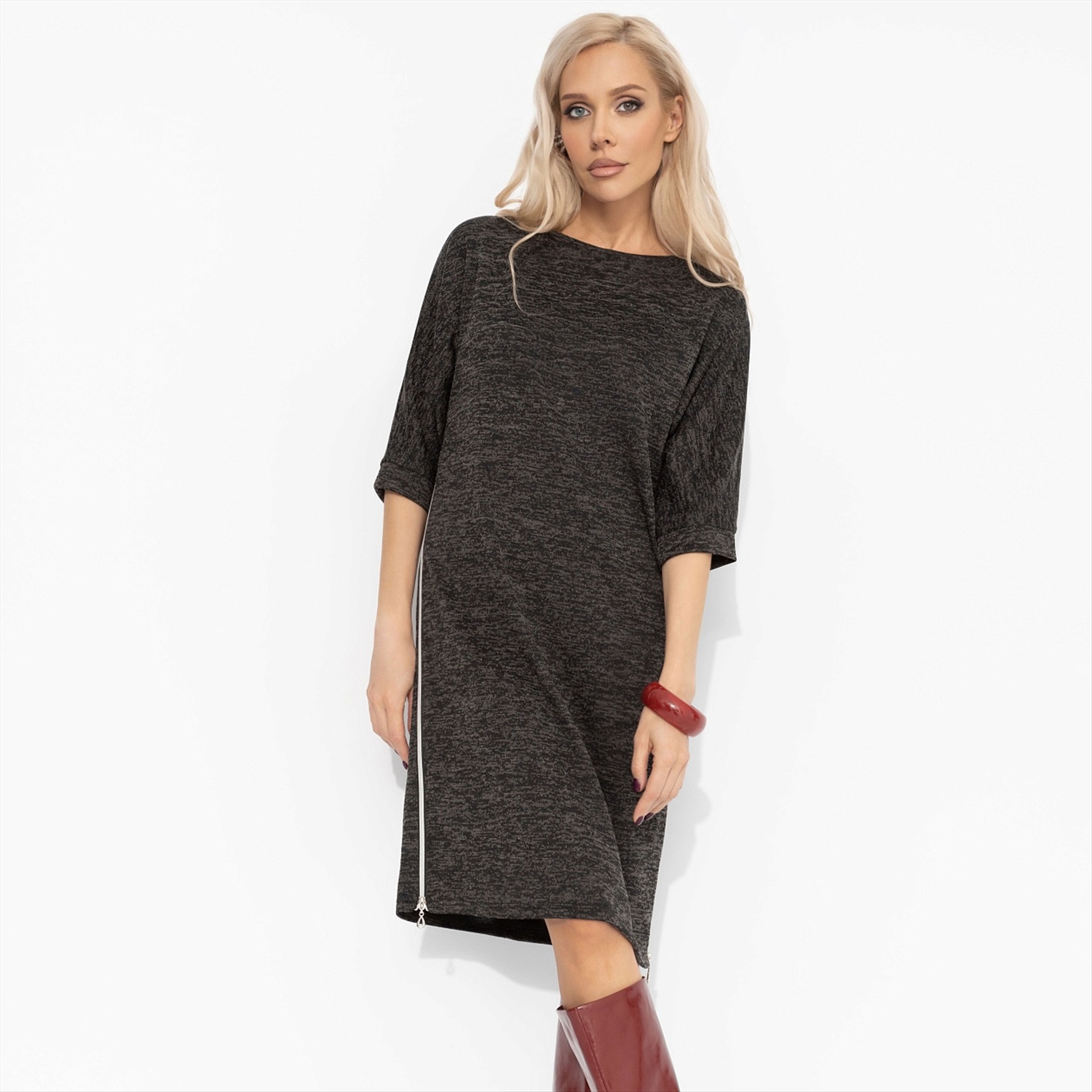 ТН ВЭД: 6104430000; Состав: «Сандра меланж» (80% п/э, 20% вискоза); Плотность ткани: Средняя; Тип ткани: Трикотаж; Декоративные элементы: Молния в боковом шве; Карманы: Нет; Основной цвет ткани: Черный; Отрезная талия: Нет; Подклад: Нет; Резинка по талии: Нет; Рисунок/раппорт: Нет, все изделия идентичны; Сезон: Демисезон; Силуэт: Прямой; Стиль: Повседневный