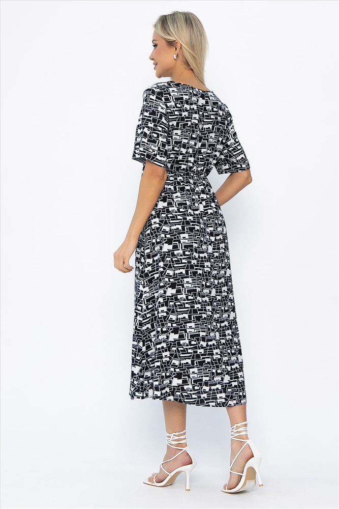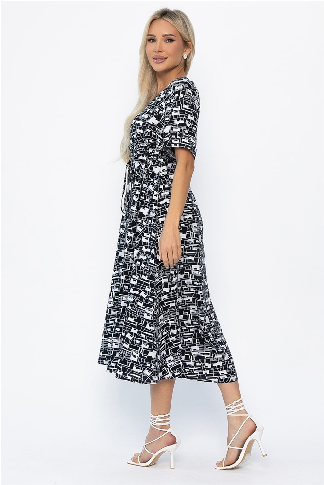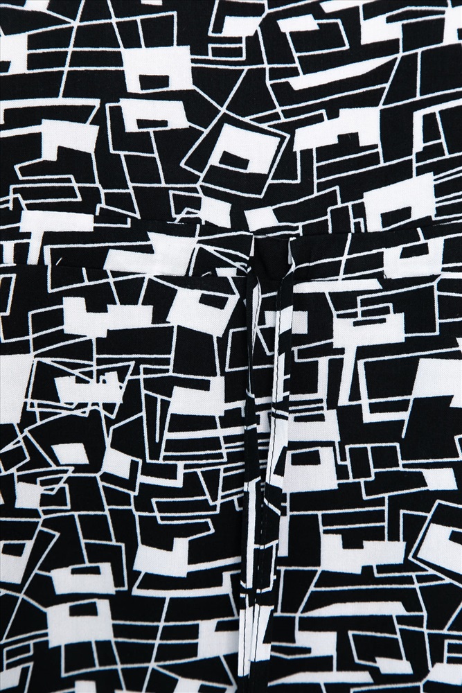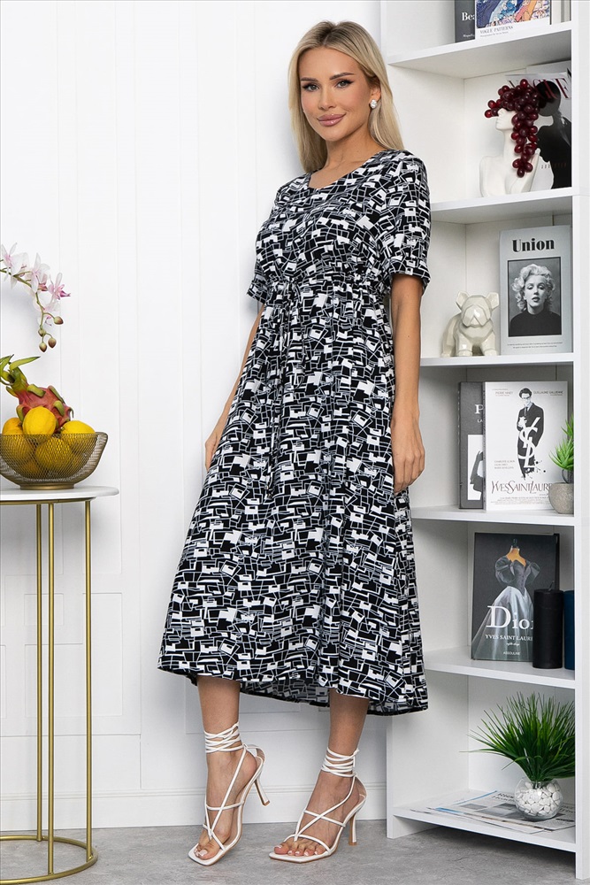 Платье свободного кроя в черно-белой расцветке станет незаменимым предметом вашего летнего гардероба. Оно сочетает в себе легкость, практичность и стиль. Короткий рукав с аккуратной манжетой придает образу особый шарм, а округлый вырез горловины делает шею визуально длиннее. Завышенная линия талии подчеркивает фигуру. Резинка на спине и кулиса с завязками на передней части позволяют регулировать объем. Юбка расклешенная, что придает образу легкость и женственность.