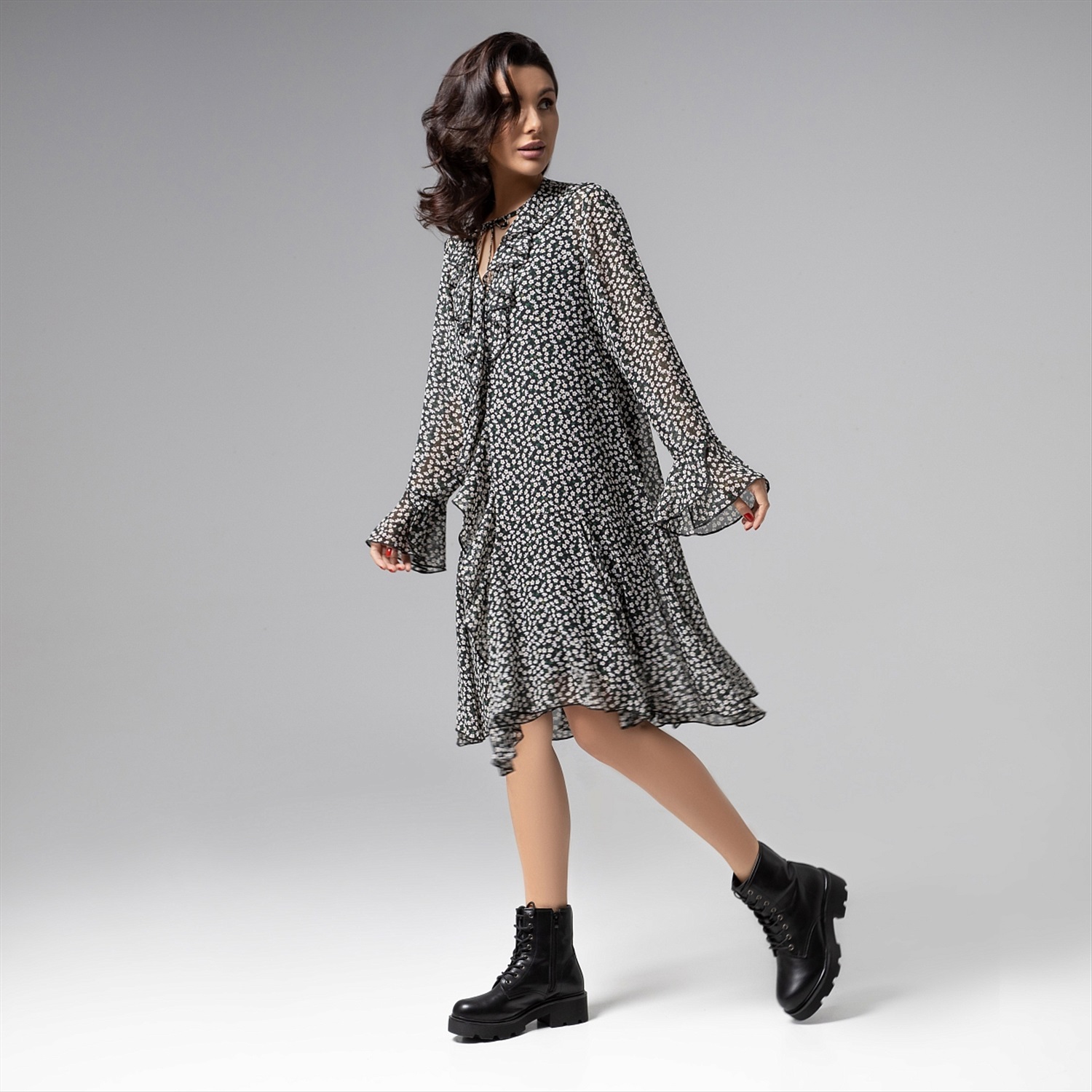 Легкость встречается с изысканностью. Воланы создают динамичный силуэт, а невесомая ткань, словно сотканная из теплого ветра, мягко обволакивает фигуру, подчеркивая её естественную гармонию. Универсальный крой, продуманный до мелочей, создает идеальные пропорции на любом типе фигуры. Воплощенная нежность бохо-эстетики, где каждая складка шепчет о свободе и женственности. Платье в длине до колена. Дополнено завязками в зоне декольте. Изделие с подкладом.