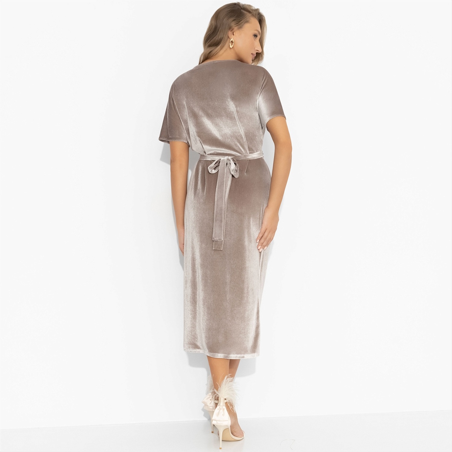 Бой курантов всё ближе. В бокалах играет свет гирлянд, а она улыбается – в отражении свечей сияет бархат. Ткань оттенка шампанского эффектно драпируется, подчеркивая изгибы и настроение. Акцент на талии, лёгкий блеск – и праздник начинается с неё. Платье на запах с эффектной драпировкой.