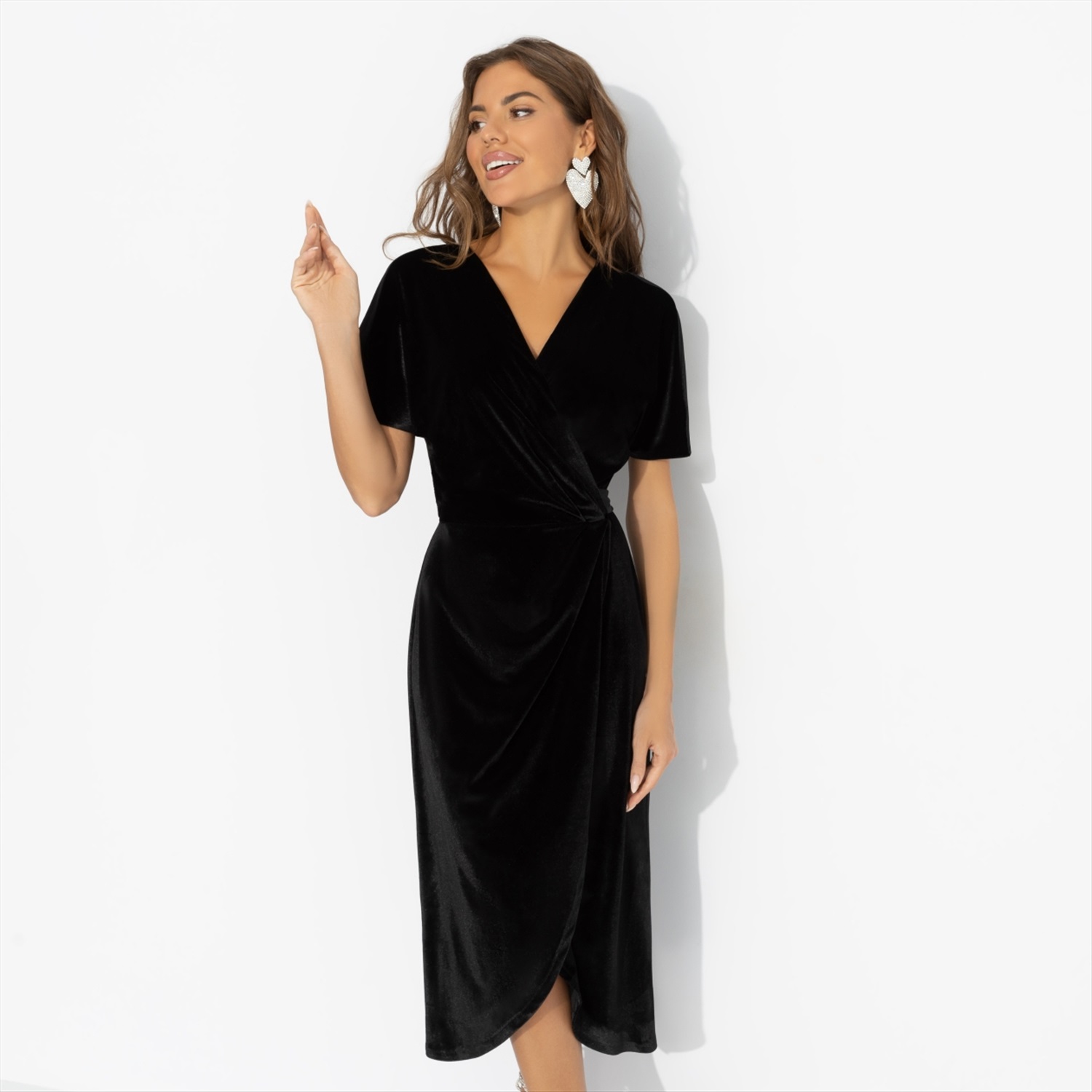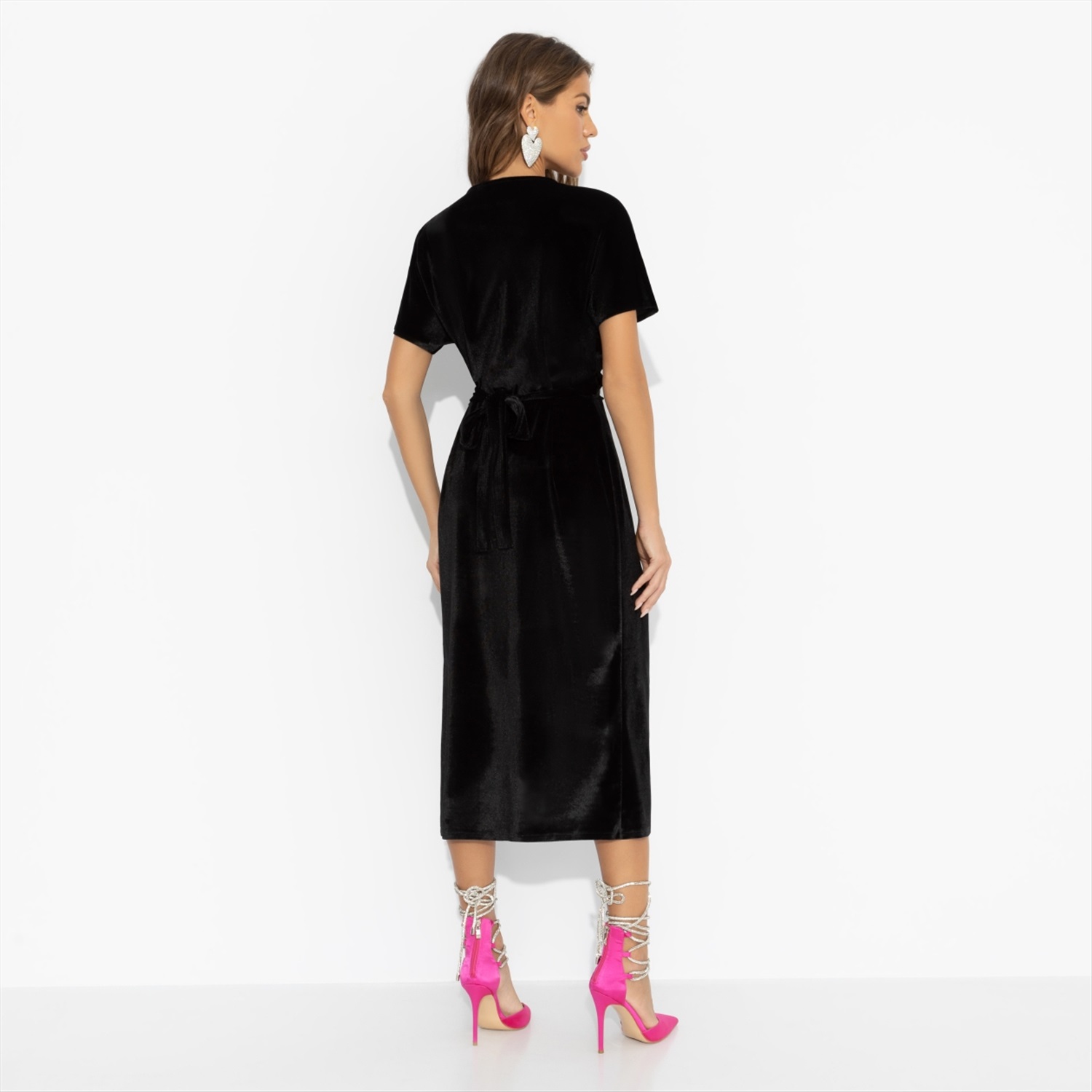 ТН ВЭД: 6204430000; Состав: Бархат (95% п/э, 5% спандекс); Плотность ткани: Средняя; Тип ткани: Трикотаж; Вид застежки: Пояс; Карманы: Нет; Основной цвет ткани: Черный; Отрезная талия: Есть; Подклад: Нет; Резинка по талии: Нет; Рисунок/раппорт: Нет, все изделия идентичны; Сезон: Круглогодичный; Силуэт: Приталенный