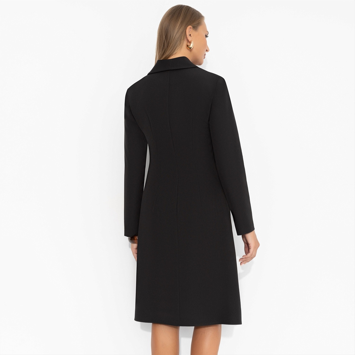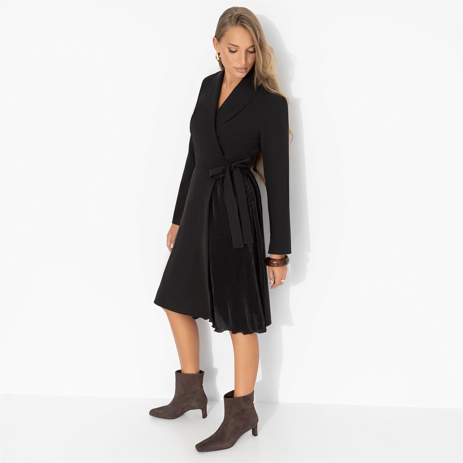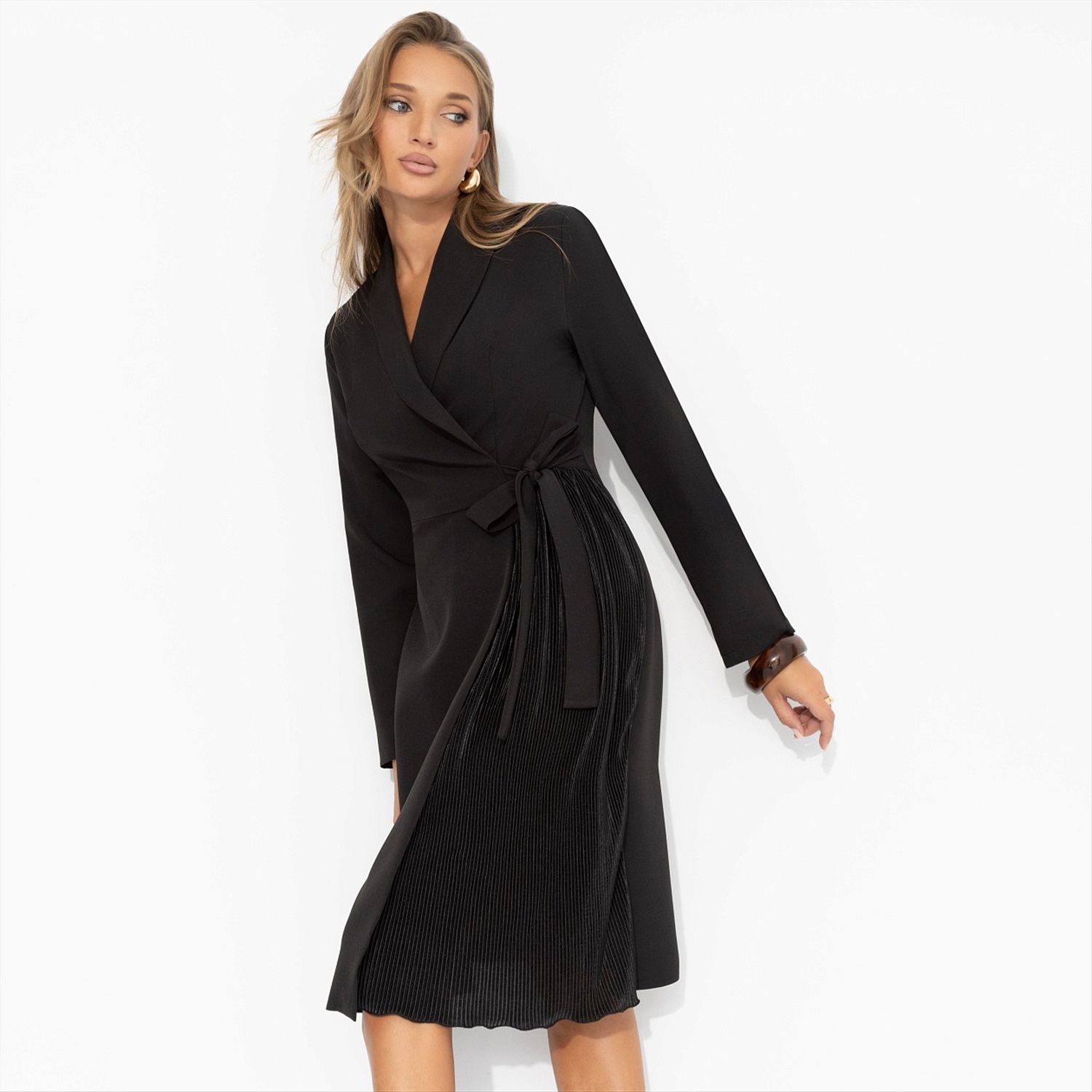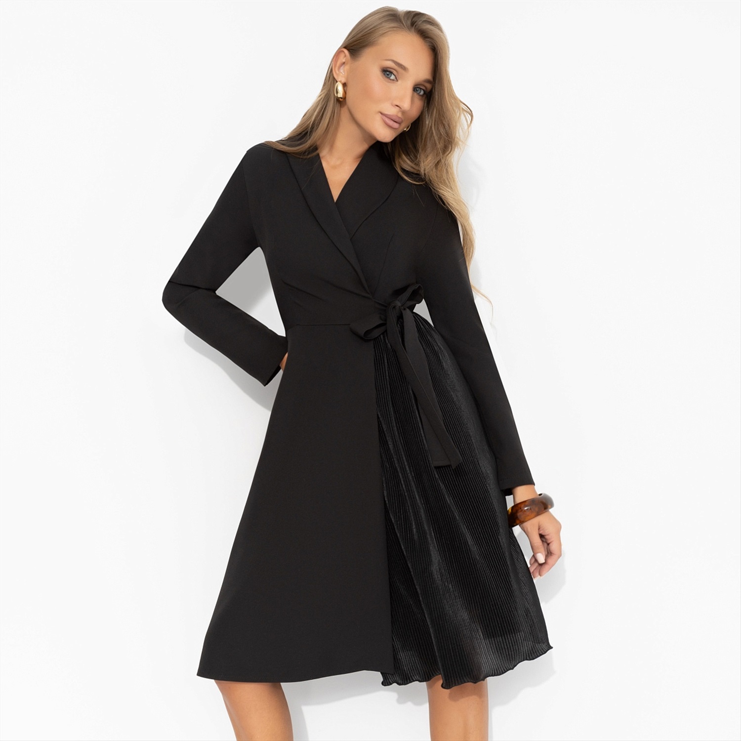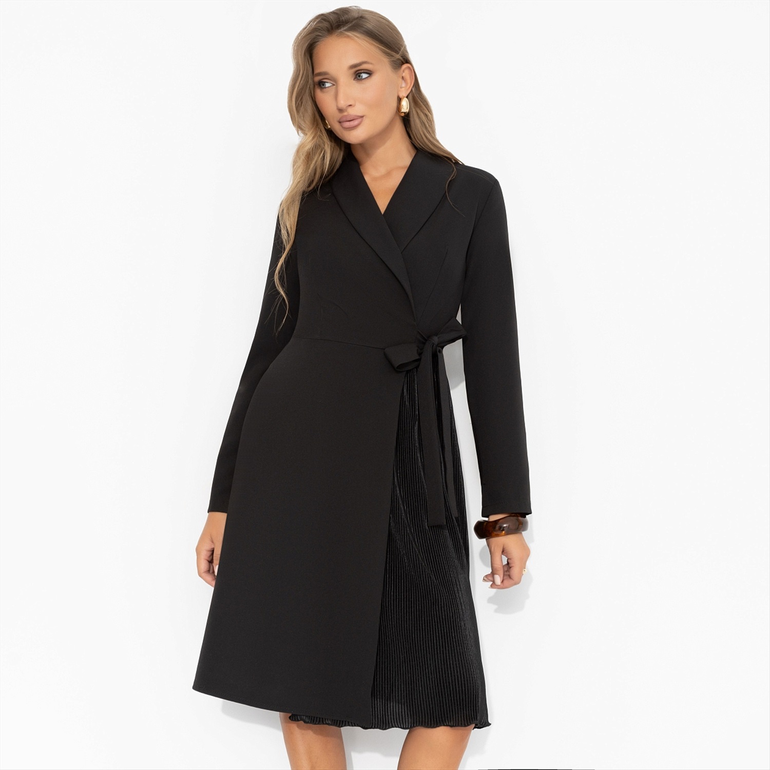 ТН ВЭД: 6204430000; Состав: «Барби», трикотаж «гофре» (60% полиэстер, 37% вискоза, 3% спандекс); Плотность ткани: Средняя; Тип ткани: Текстиль; Вид застежки: Завязки; Карманы: Нет; Основной цвет ткани: Черный; Отрезная талия: Есть; Подклад: Нет; Резинка по талии: Нет; Рисунок/раппорт: Нет, все изделия идентичны; Сезон: Круглогодичный; Силуэт: Приталенный Грудь: 90 см Талия: 65 см Бёдра: 91 см Рост: 168 см. Размер на модели: 44 Длина изделия: * 44 размер - 97,5 см * 46 размер - 98 см * 48 размер - 98,5 см * 50 размер - 99 см * 52 размер - 99,5 см * 54 размер - 100 см Длина рукава: * 44 размер - 60 см * 46 размер - 60 см * 48 размер - 60 см * 50 размер - 60 см * 52 размер - 60 см * 54 размер - 60 см Обхват груди: * 44 размер - 88 см * 46 размер - 92 см * 48 размер - 96 см * 50 размер - 100 см * 52 размер - 104 см * 54 размер - 108 см Обхват талии: * 44 размер - 70 см * 46 размер - 74 см * 48 размер - 78 см * 50 размер - 82 см * 52 размер - 86 см * 54 размер - 90 см Обхват бёдер: * 44 размер - 94 см * 46 размер - 98 см * 48 размер - 102 см * 50 размер - 106 см * 52 размер - 110 см * 54 размер - 114 см Вес товара, кг: * 52 размер - 0.44 * 54 размер - 0.45 Габариты товара (ДхШхВ), см.: * 52 размер - 32 х 32 х 3 * 54 размер - 32 х 32 х 4 Элегантное платье от ЧАРУТТИ – идеальное решение для насыщенного дня, когда родительское собрание сменяется романтическим свиданием. Его лаконичный силуэт подчеркивает фигуру, не облегая навязчиво. Универсальный глубокий черный цвет и изящные линии создают образ собранный и строгий для школы, но в то же время загадочный и чувственный для вечера. В этом платье вы будете неотразимой мамой днём и очаровательной женщиной вечером, совершив безупречный переход в одной вещи. Платье в длине миди на запах. Приталенный силуэт формируется за счёт пояса. Платье с лацканами. Часть юбки выполнена из акцентного текстурного материала-гофре. Пояс вшит в изделие.